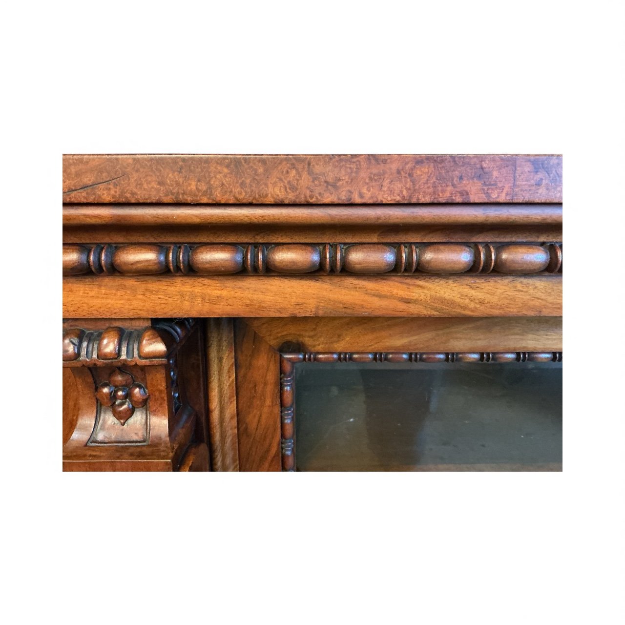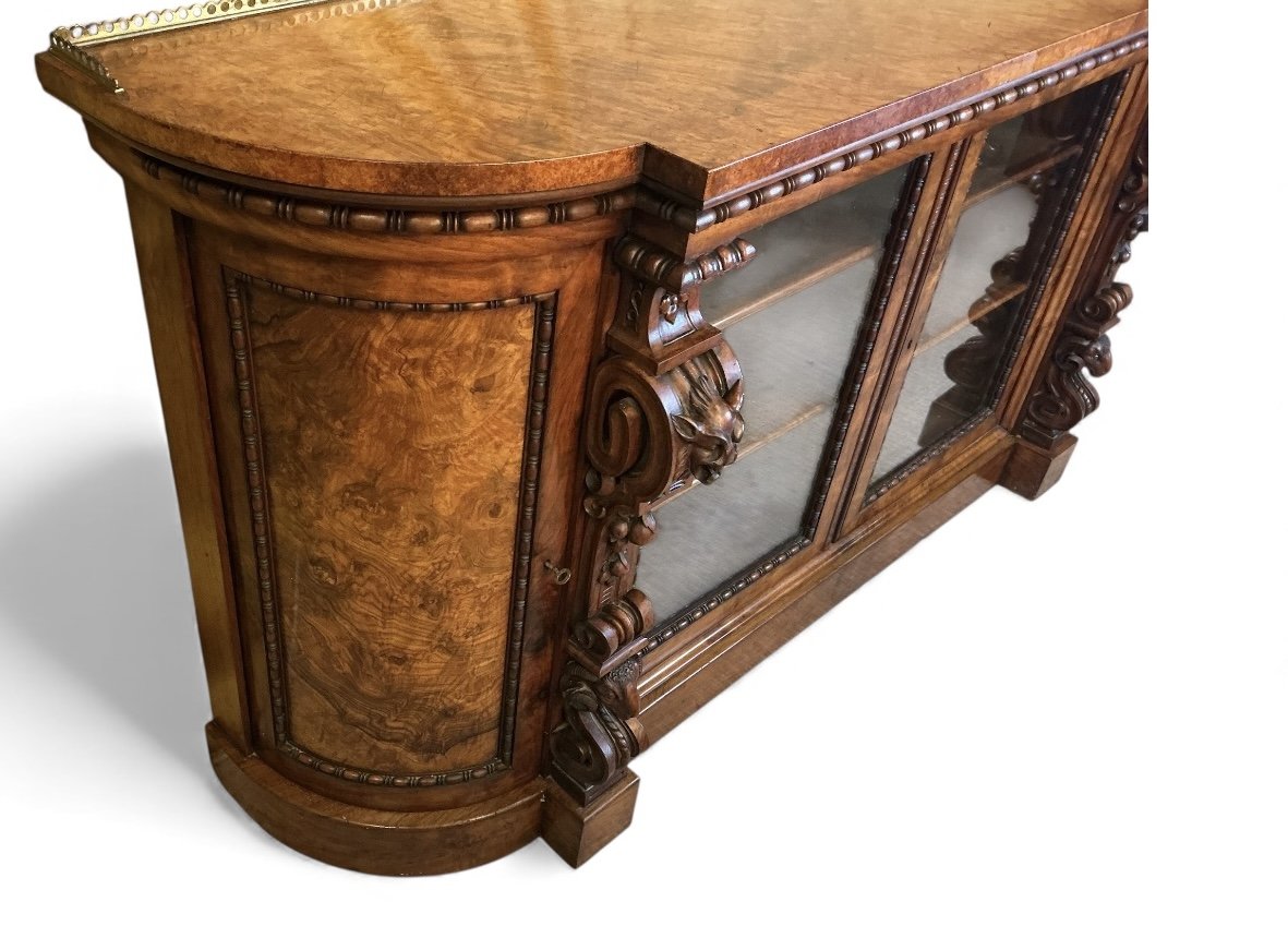 Superb Quality Victorian Credenza/Cabinet, having bowed ends with central glazed doors, the centre doors flanked by superbly carved pillars having a mythical Lion's head over fruit and a Ram's head, the blind doors and frieze having egg and dart moulding and standing on a plinth base.