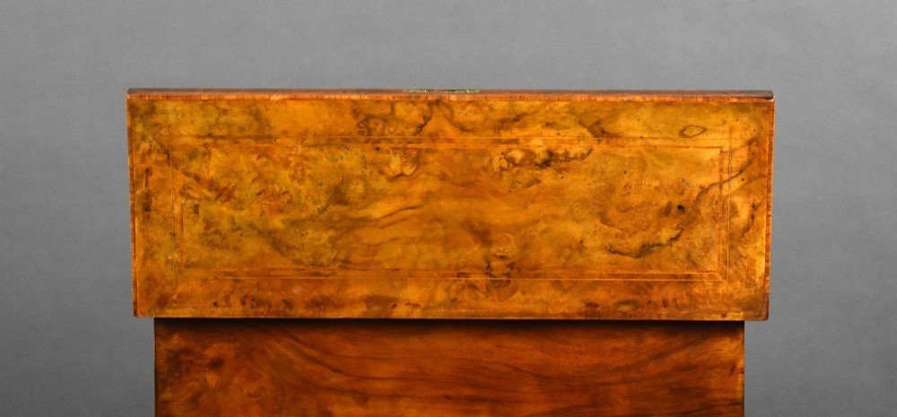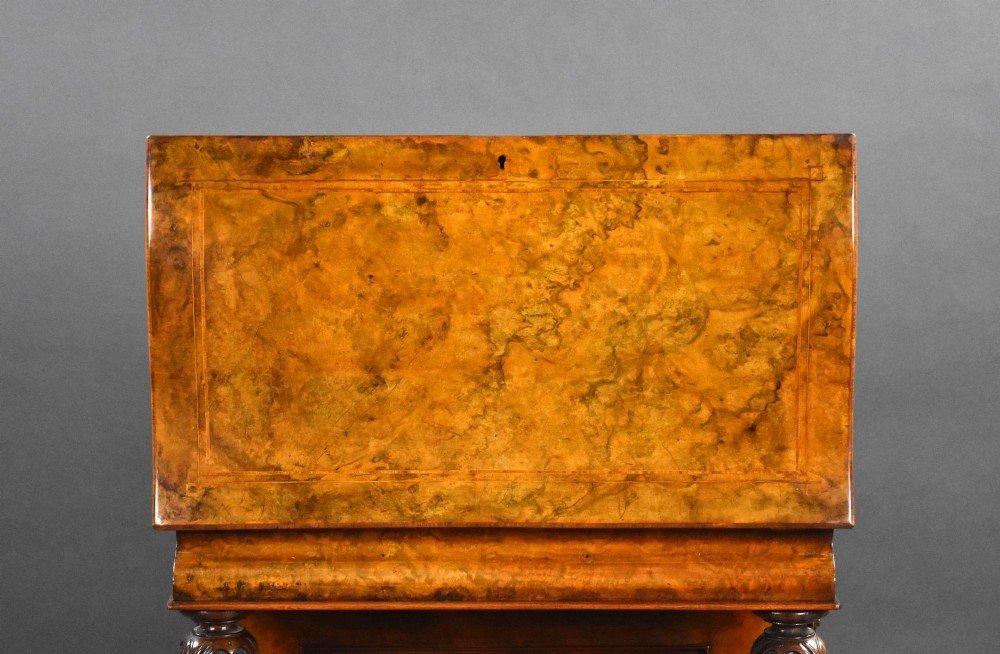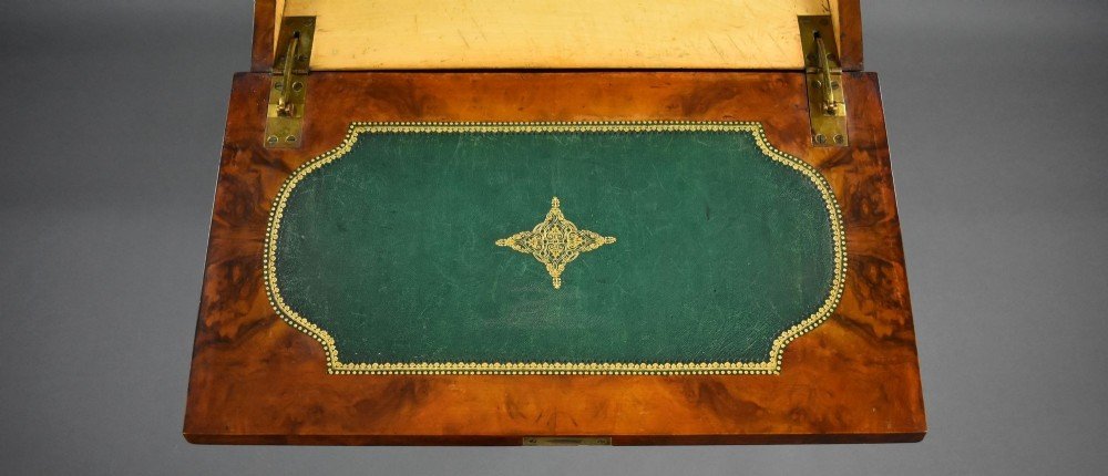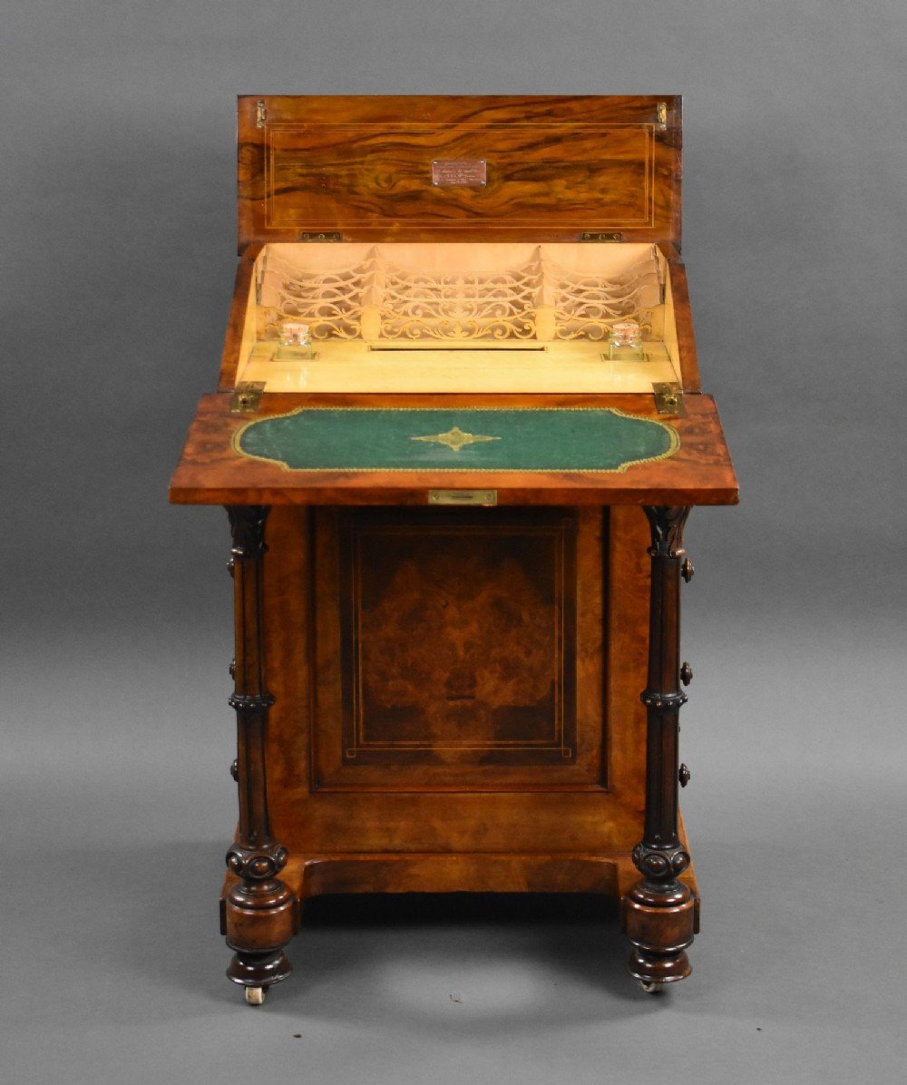A fine quality Victorian Davenport desk, crafted from beautifully figured burr walnut with decorative inlay. The sloped writing surface is inset with a green gilt-tooled leather and lifts to reveal a fitted interior with pigeonholes and small drawers. One side is fitted with four graduated drawers, the opposite side with matching dummy fronts for symmetry. Supported on bold baluster turned front columns and standing on bun feet with concealed castors, this elegant and compact writing desk is both highly decorative and practical.