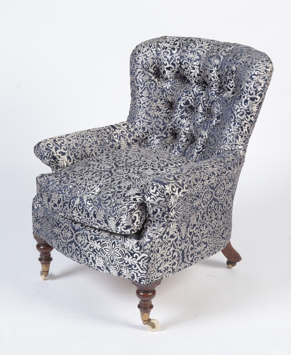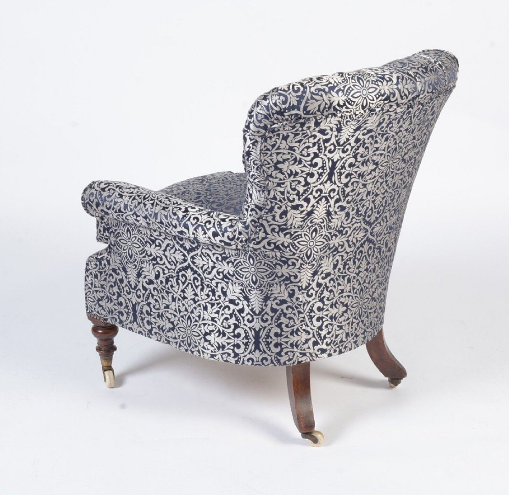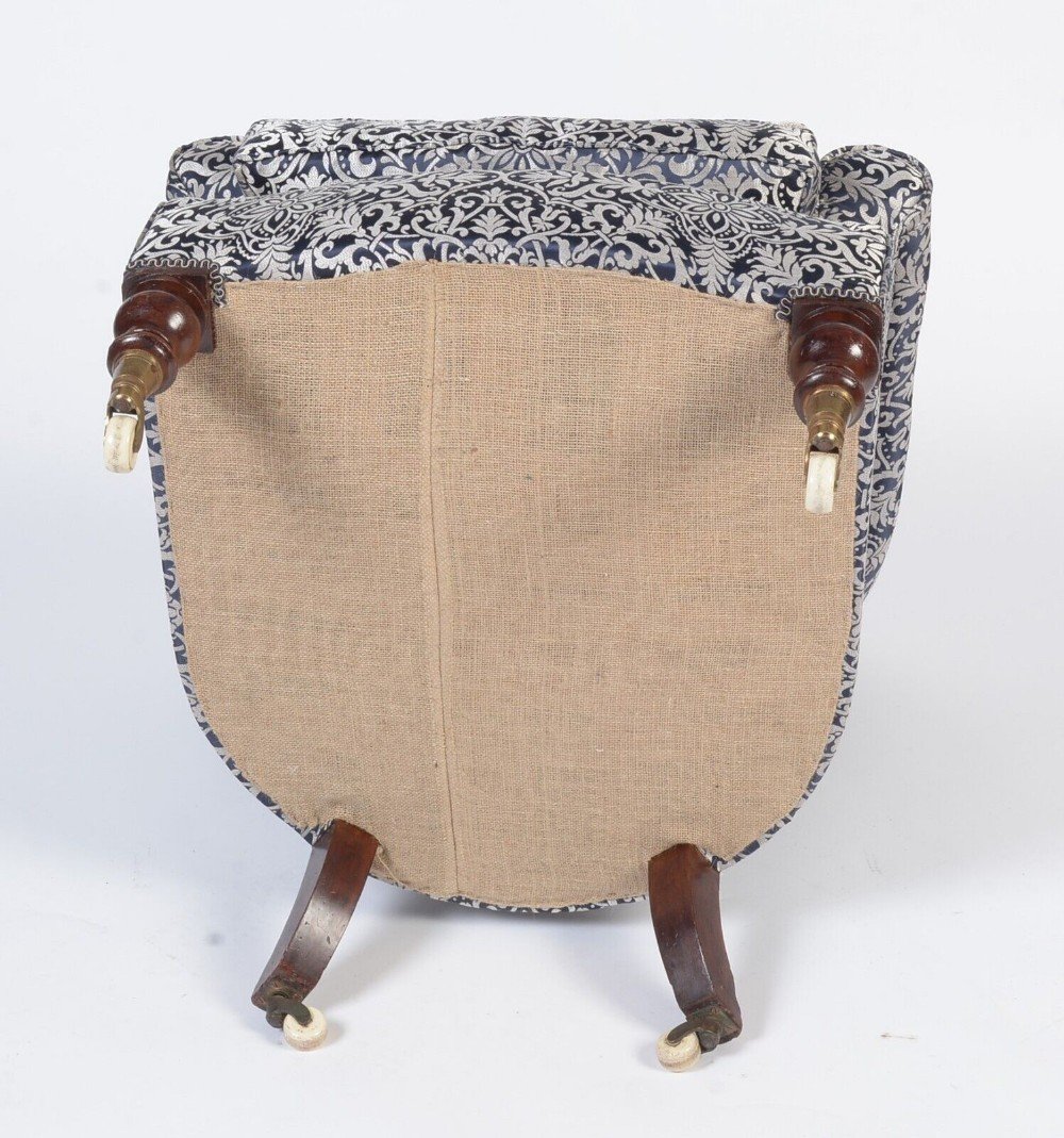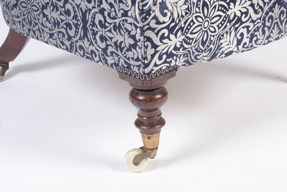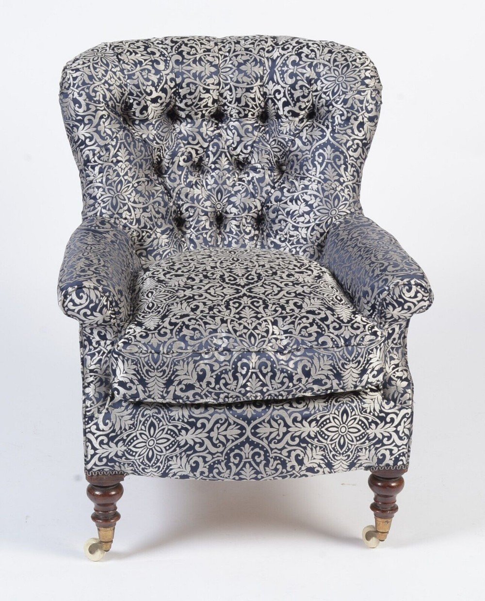 This beautiful silver and navy blue button back armchair is a really attractive shape that showcases Victorian style and craftsmanship. Raised on solid mahogany turned front legs with original brass and porcelain castors it exudes a sense of elegance and luxury that will enhance any room. Its silver and rich blue colour and timeless appeal make it the perfect addition to any room, while its sturdy construction ensures that it will be enjoyed for many years to come. This has been expertly fully reupholstered recently to the highest standards and is extremely comfortable having a lovely large separate feather filled seat cushion.
