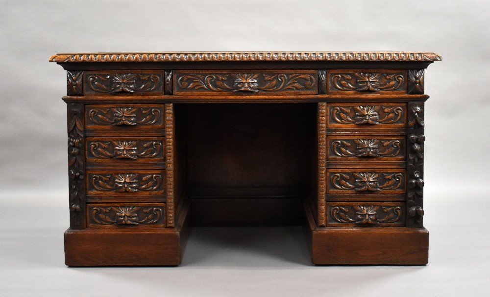 A substantial and highly decorative Victorian carved oak pedestal desk dating from the late 19th century. This impressive desk features a richly patinated oak frame with a moulded top inset with a traditional green leather writing surface, bordered with gilt tooling. The front is arranged with an arrangement of nine drawers, each beautifully carved with foliate and scroll motifs, reflecting the quality craftsmanship typical of the Victorian period.