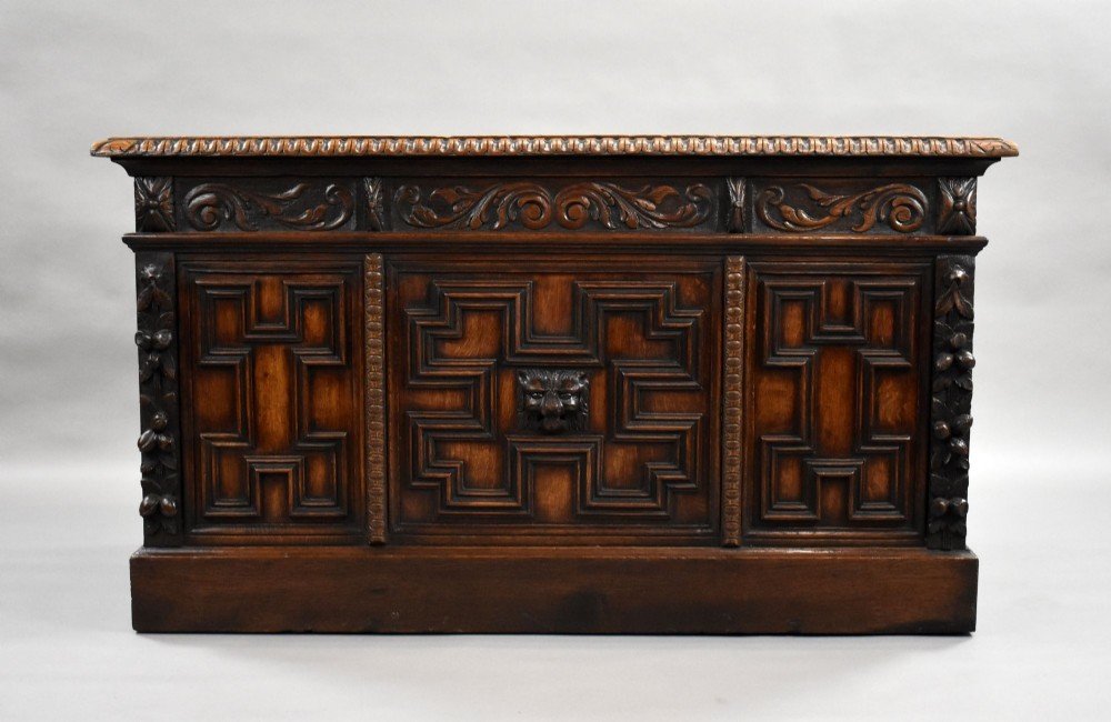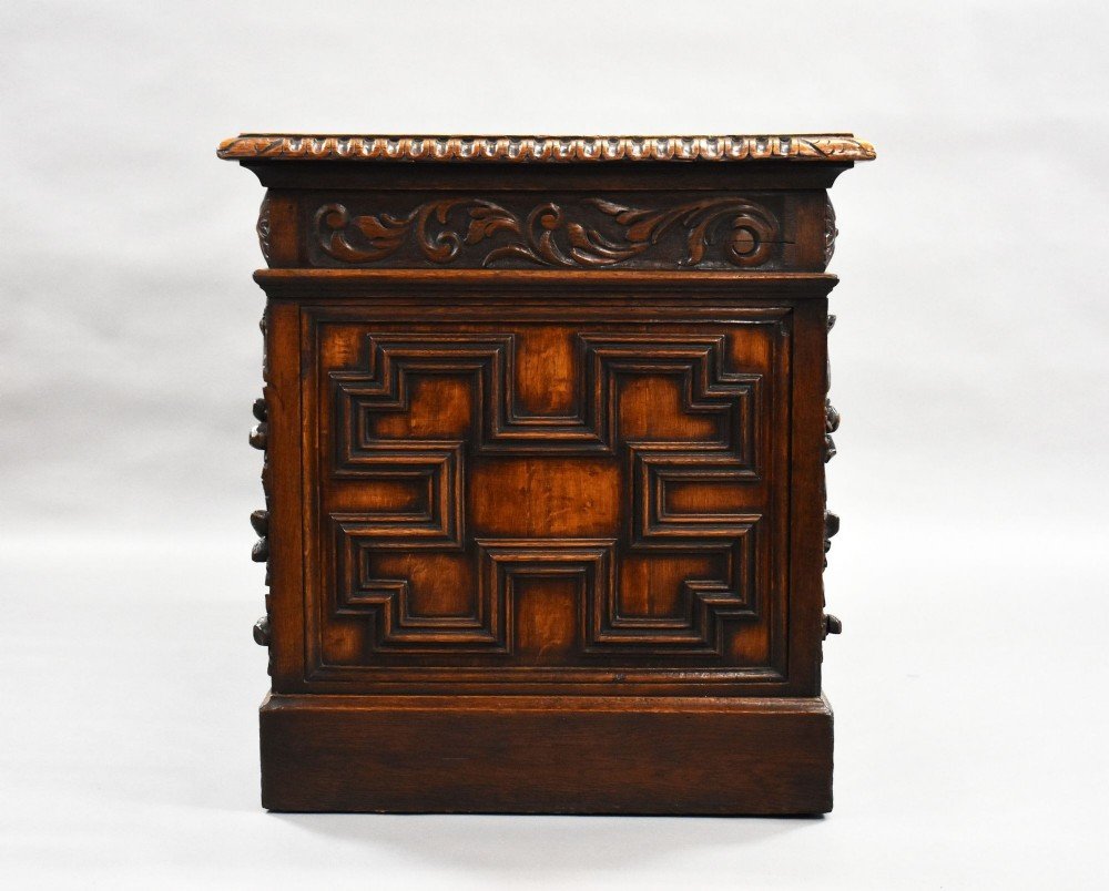 The desk stands on two solid pedestals, each with banks of drawers and bold plinth bases, providing generous storage and a strong architectural presence. The sides and rear are equally well finished, featuring striking geometric fielded panels and further carved decoration, allowing the desk to be freestanding within a room if desired.