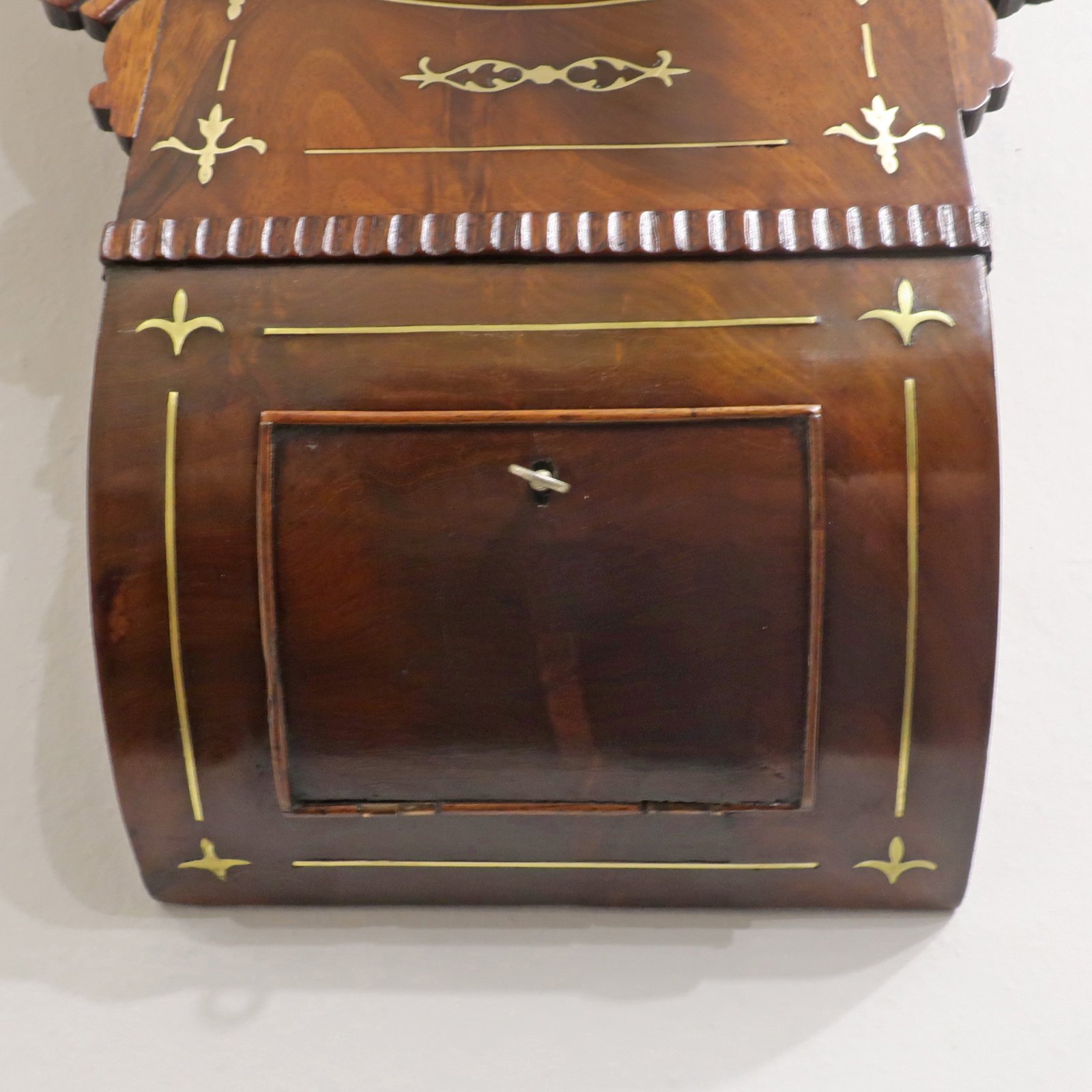 A good quality early Victorian mahogany drop dial wall clock with decorative brass and string inlay to the front of the case with fluted moulding. The clock has a brass bezel and a 12 inch painted dish dial with Roman numerals,