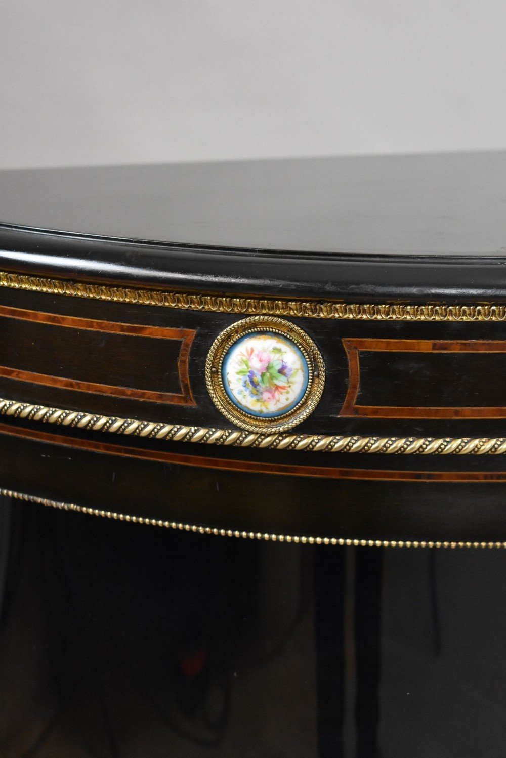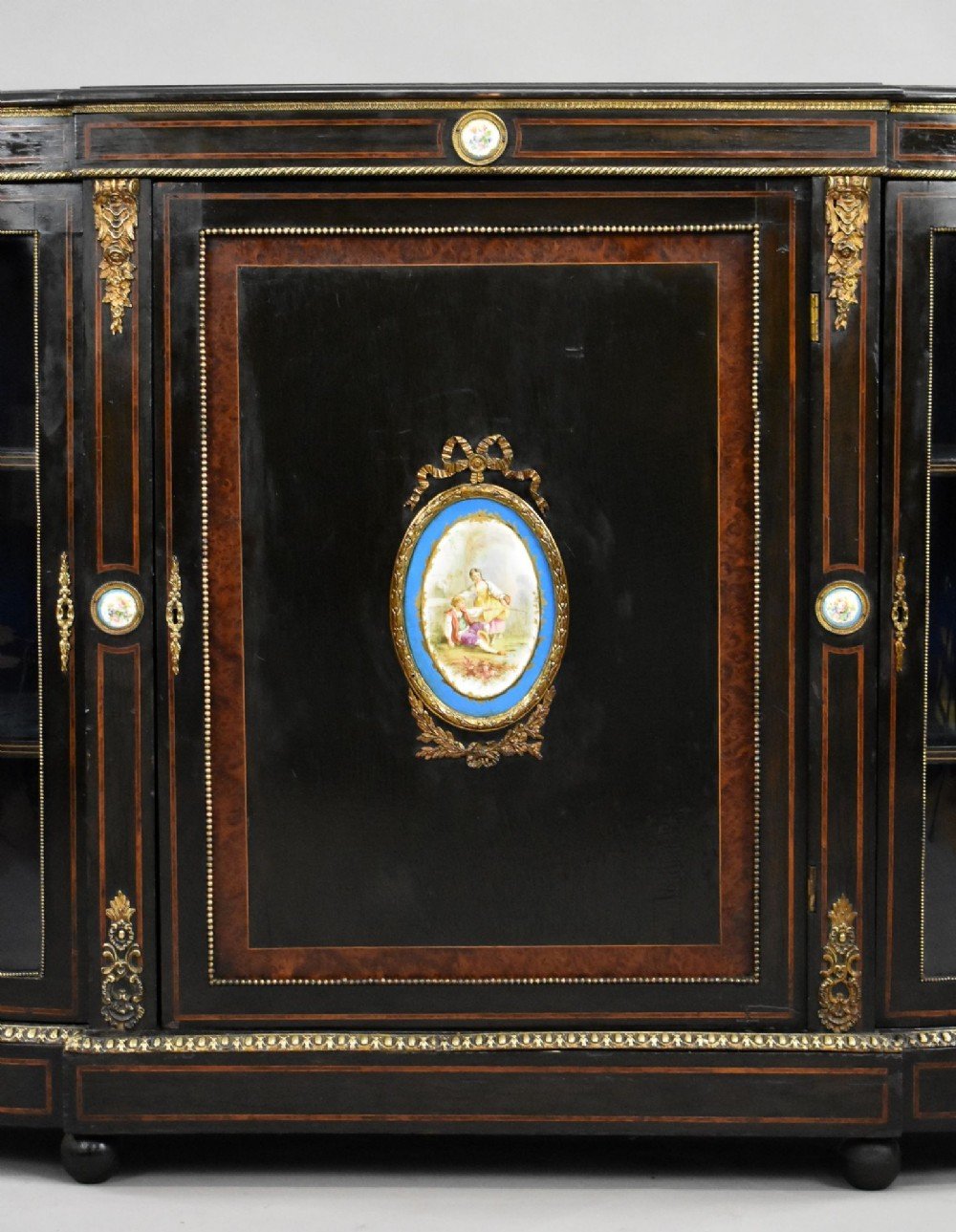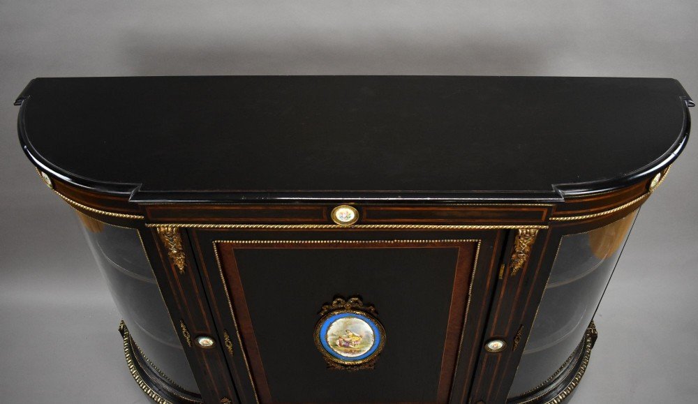 A late Victorian ebonised credenza, richly embellished with fine ormolu mounts and hand-painted porcelain plaques in the French Louis XVI style.