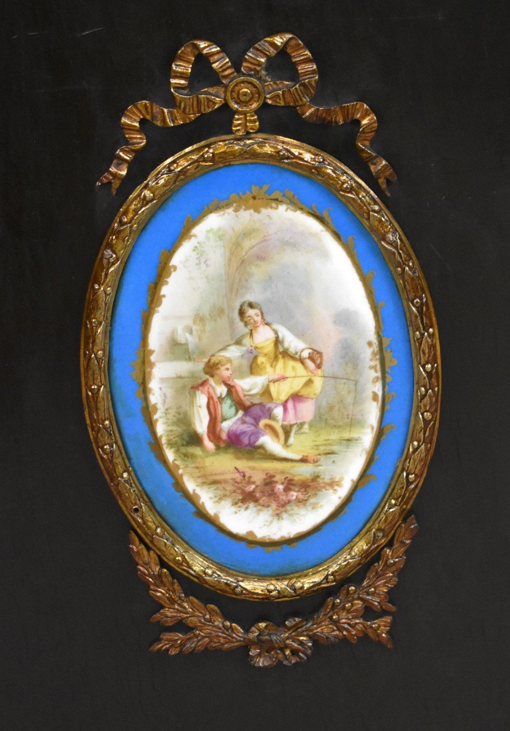 The shaped front features a central panel adorned with an oval Sevres-style porcelain plaque depicting a romantic pastoral scene, framed by ornate gilt mounts. Matching circular porcelain roundels further decorate the frieze and door panels, adding symmetry and opulence.