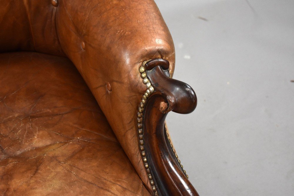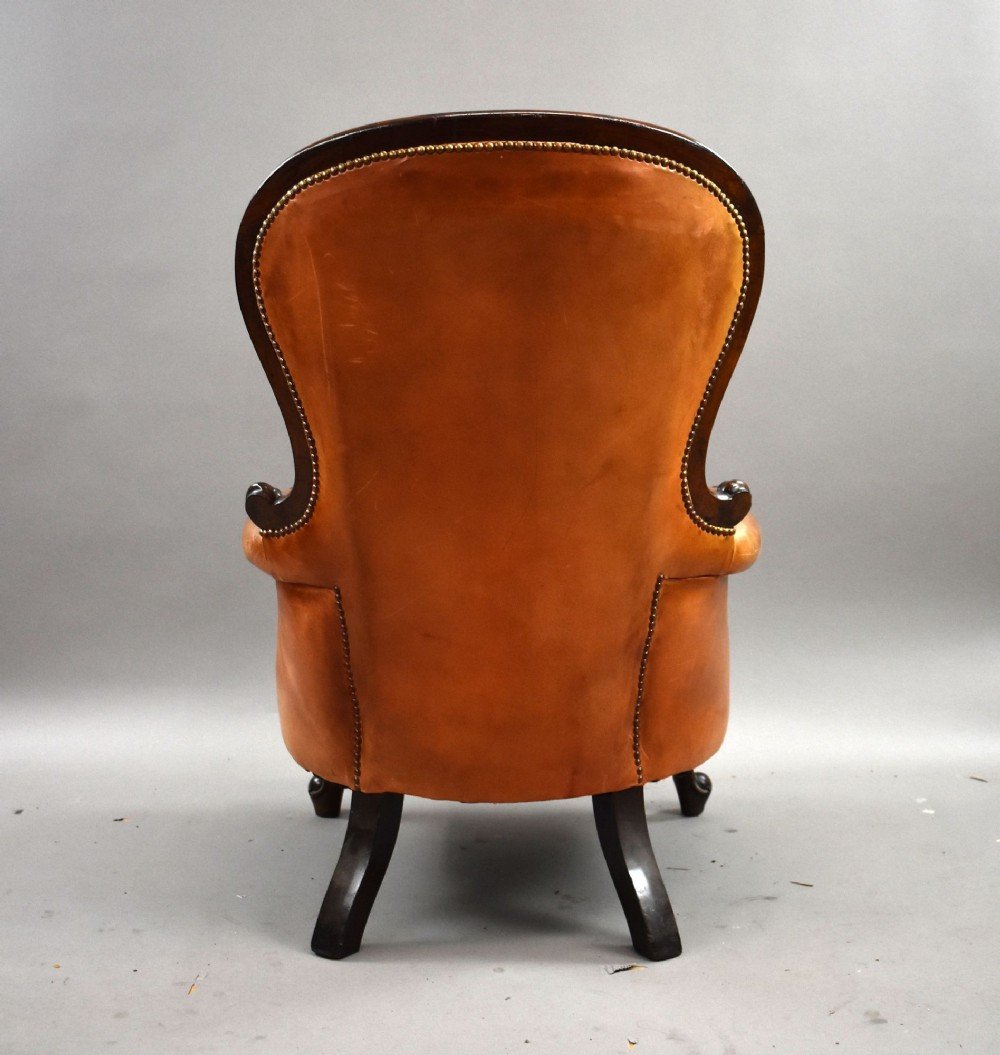 A handsome Victorian period leather armchair of classic form, featuring a deep buttoned back and shaped arms, raised on elegant cabriole front legs. The chair displays a rich, warm tan leather with excellent colour and character, complemented by a solid mahogany frame and traditional brass studded detailing. A comfortable and generously proportioned piece, ideal for both traditional and contemporary interiors.