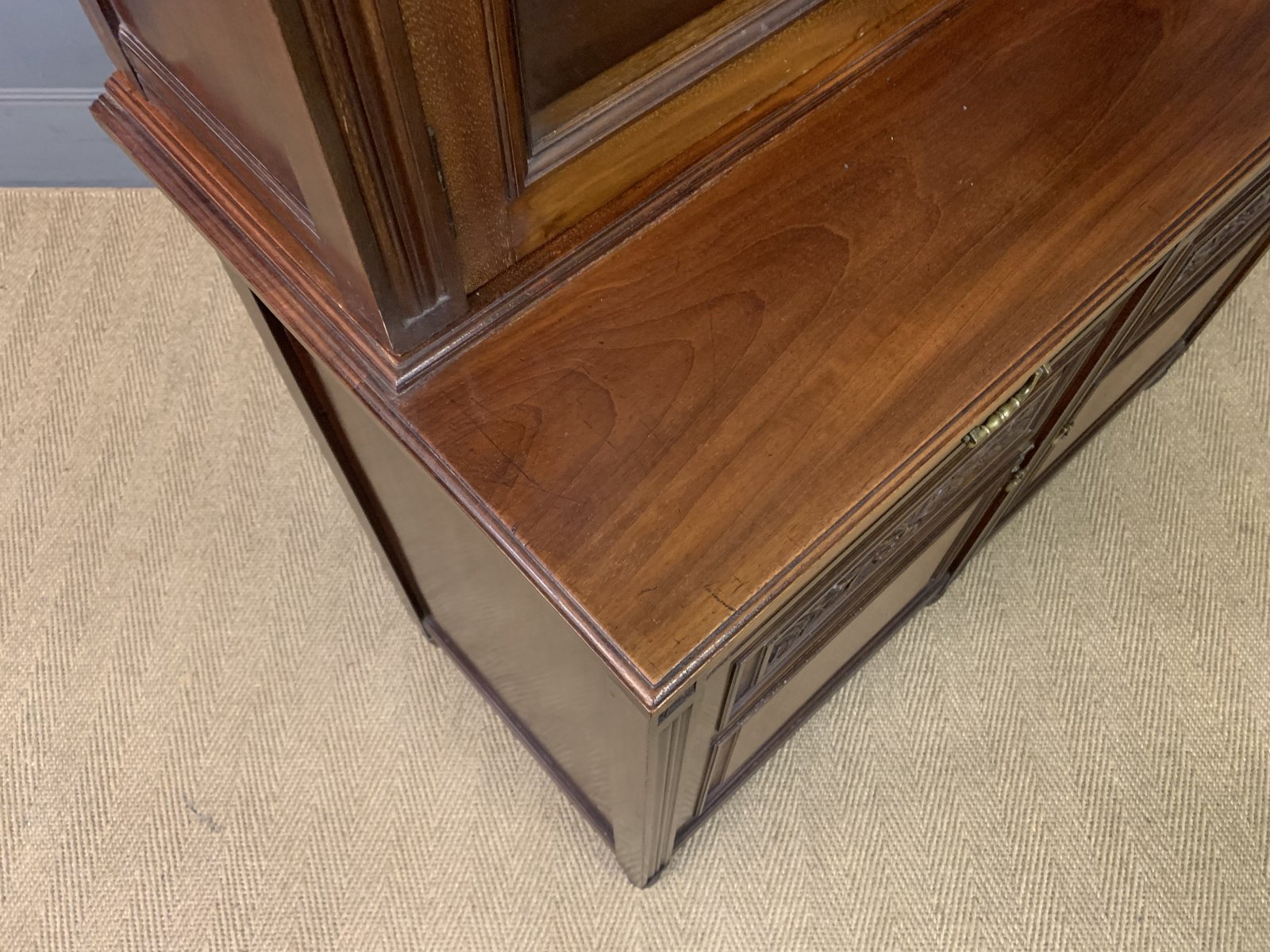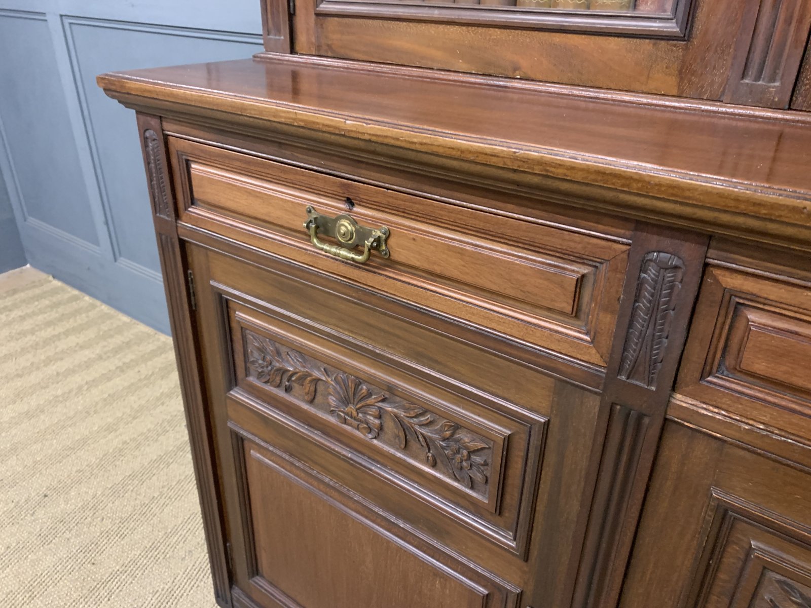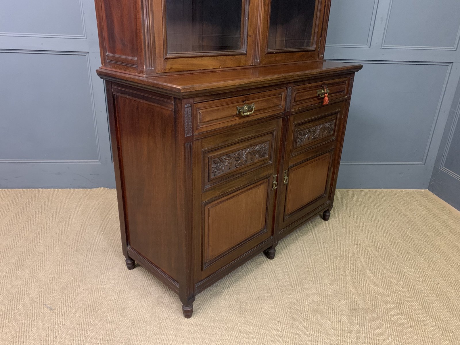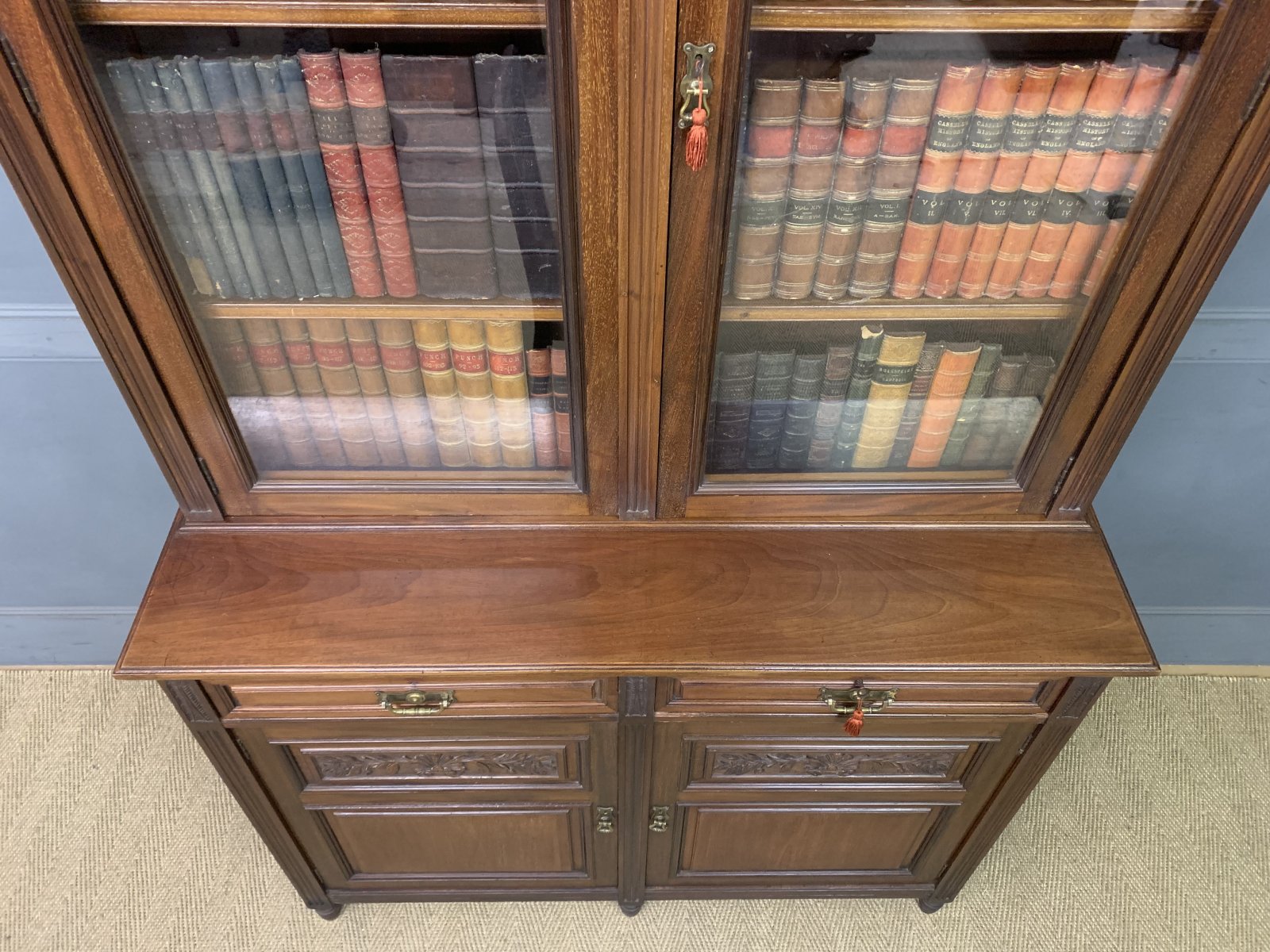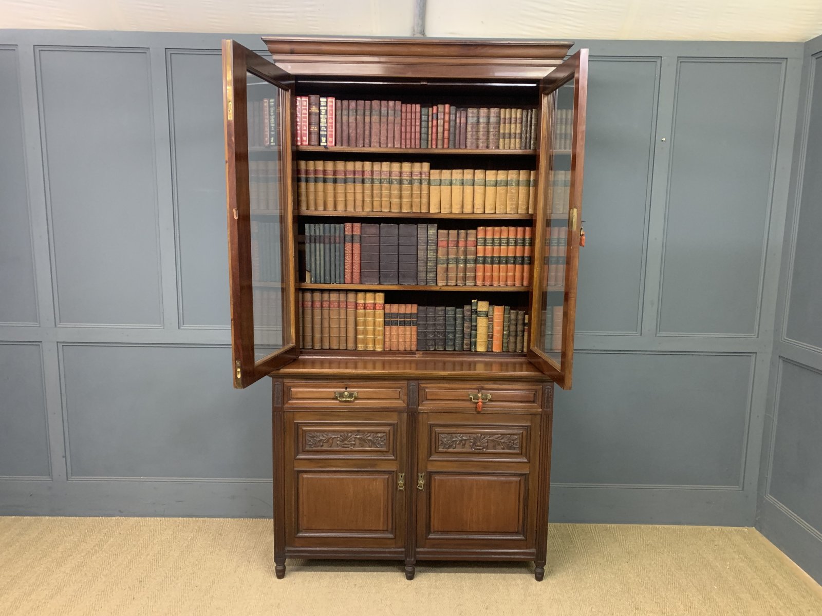A good late Victorian period mahogany bookcase. Of good construction in mahogany with mahogany drawer linings. The top section with a pair of glazed doors that open to access a display space with adjustable shelving. The bottom section with a pair of drawers over a pair of cupboard doors. The doors are decorated with floral carved panels and open to reveal shelved interiors. All doors are drawers are lockable (keys supplied). All surmounted by an over-sailing cornice and standing on turned bun feet. Polished and waxed in our workshops and now offered for sale in very good condition, ready to go straight into the home. Splits into 3 sections for ease of installation. Books not included.
