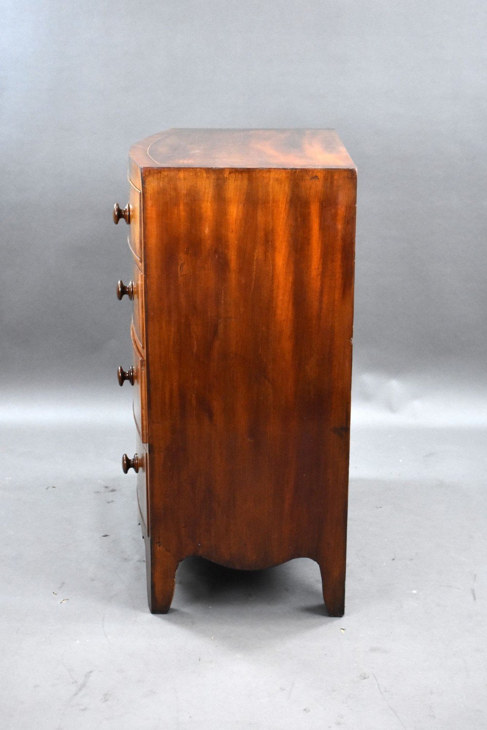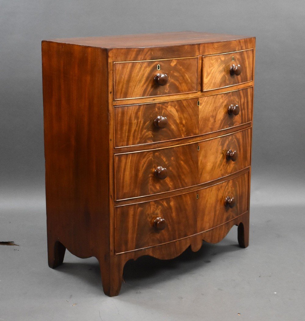 Victorian Mahogany bowfront chest drawers with two short drawers to the top and three long drawers below all with knob handles with a shaped apron to the bottom standing on splay legs.
