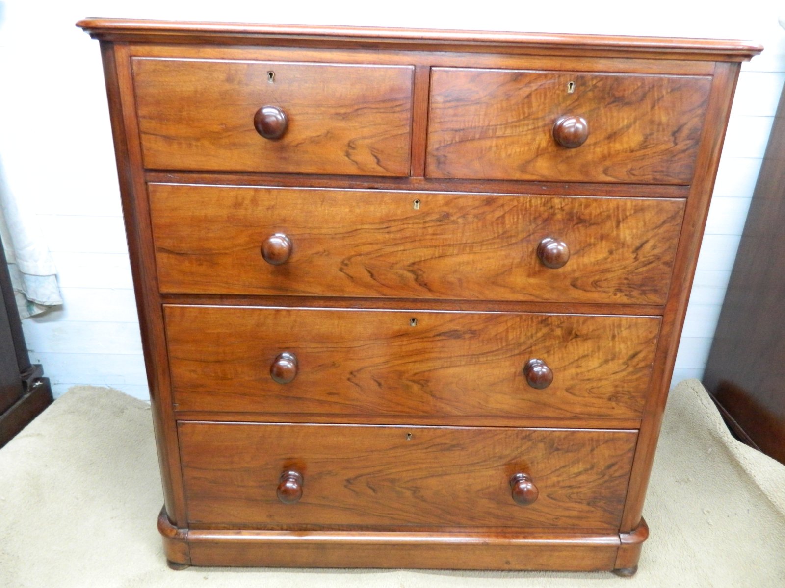 This Victorian Mahogany Chest of Drawers is a timeless piece of antique furniture, perfect for adding a touch of vintage charm to any bedroom or living space. Crafted from luxurious mahogany, this chest features five spacious drawers, each with a beautifully crafted wooden bun handle. Standing at 114cm tall and 102cm long, this chest exudes a classic Victorian style, with a rich mahogany finish that enhances its beauty and elegance. Ideal for those who appreciate the craftsmanship and elegance of bygone eras.The chest has 2 short over 3 long graduating drawers, all slide freely, the drawers are also made from mahogany making them very strong, some drawer linings have been in them before, all locks are in place no keys, with original bun handles. The fronts of the drawers have a very nice grain showing, adding that extra piece of elegance. There is small heat crack to the side, from radiator heat, something they never had 150 years ago. The chest will last another 150 years with just age related marks. Please see all pictures for condition.