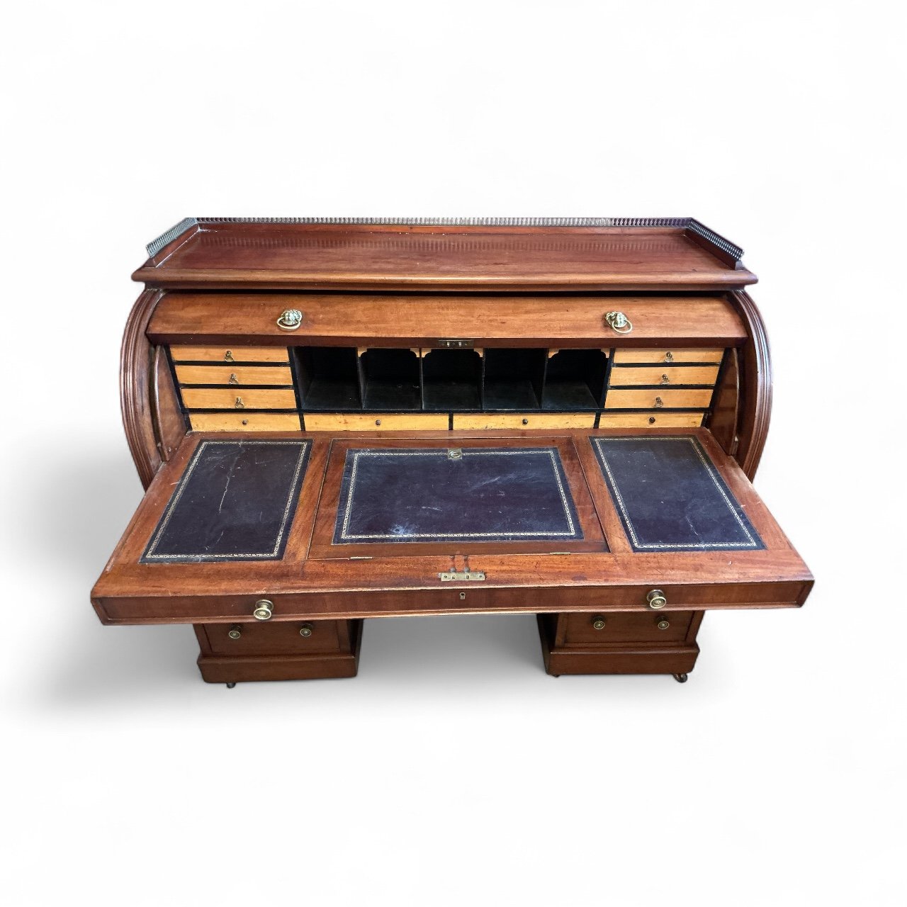 Quality Victorian mahogany cylinder desk, with brass galleried back brass lions head handles to the cylinder and embossed round brass handles to the drawers, with sliding fitted interior and tooled leather writing surface with three drawers on both sides and raised on castors.