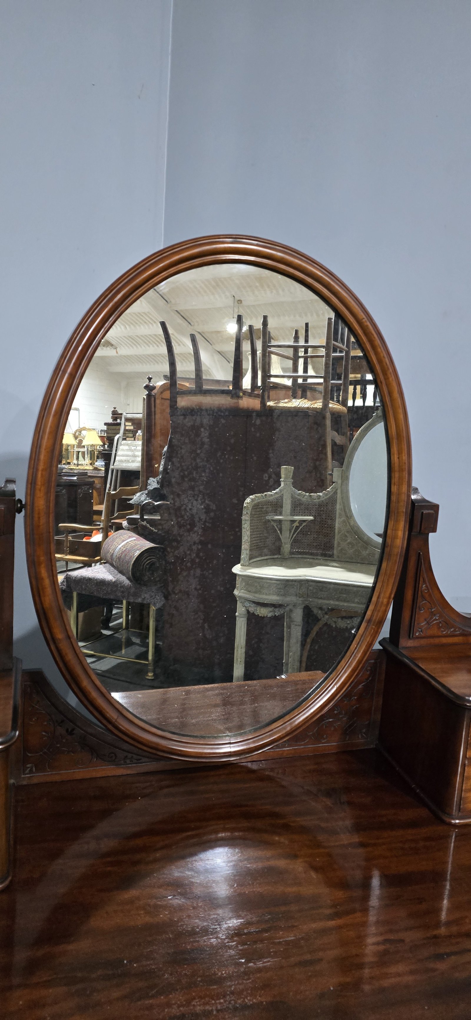 A very nice quality Victorian mahogany dressing table, mercury plate mirror, white procelain castors, jewelry drawers to the top, single drawer below, lovely colour and condition.
