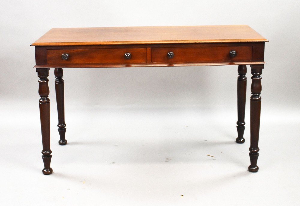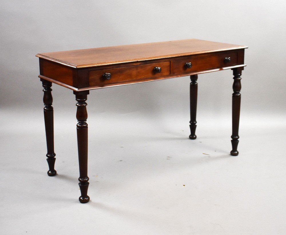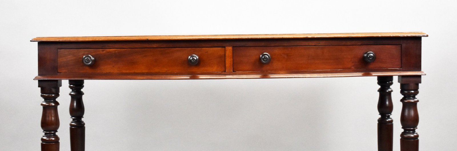 The rectangular top sits above a pair of frieze drawers, each fitted with turned wooden knobs and offering useful storage for everyday items. The drawers are neatly integrated into the apron, maintaining the clean and balanced appearance of the piece.