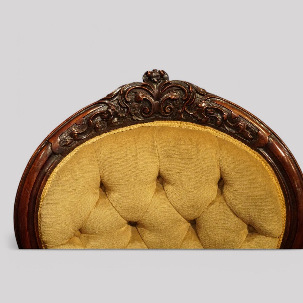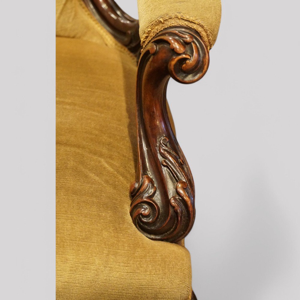 Having a beautifully carved top rail on the wooden frame, the spoon back shape runs down to the padded armrest and the flowing arm supports with the wonderful carving.