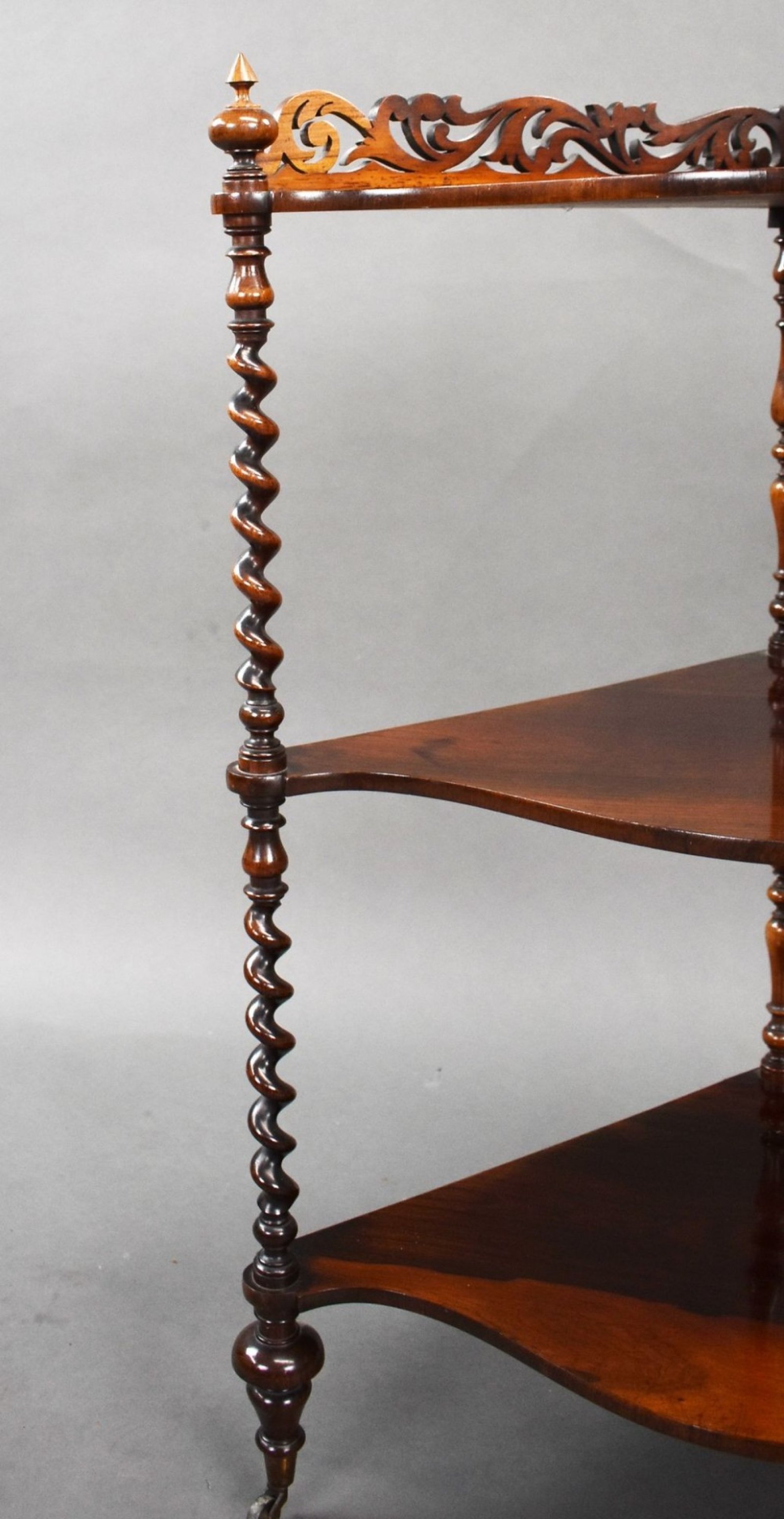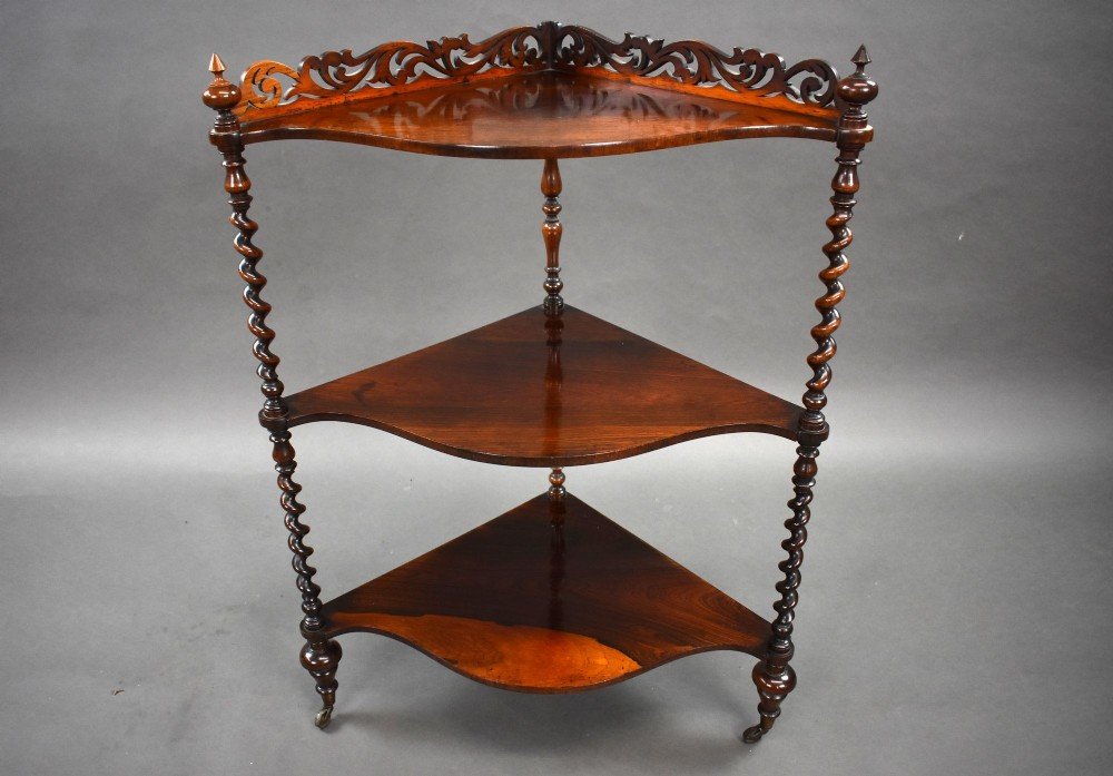 For sale is a good quality Victorian rosewood corner whatnot, having a fretwork gallery to the top tier, with a further two tiers below, with turned supports, raised on castors, this piece is in excellent condition for its age.
