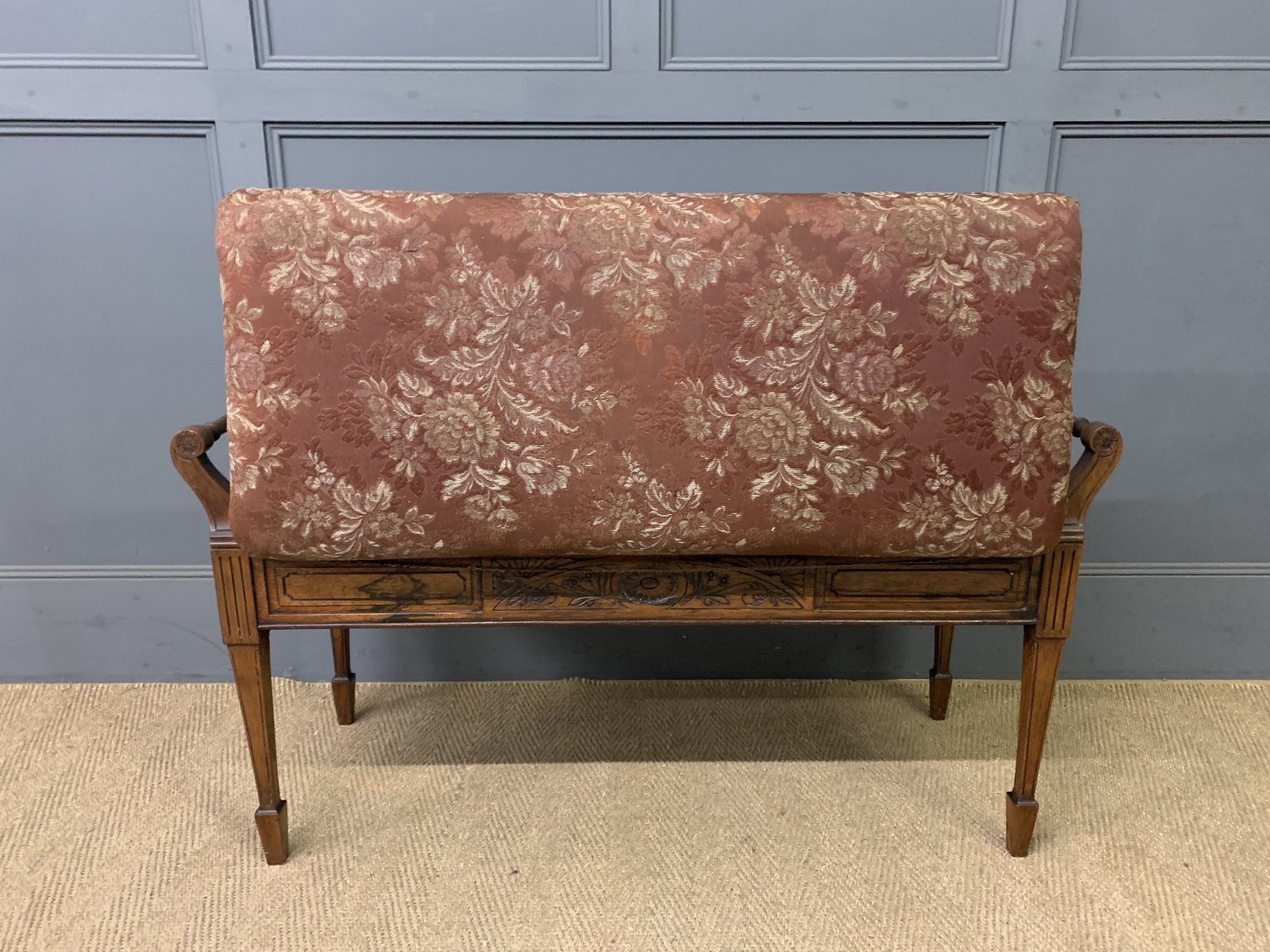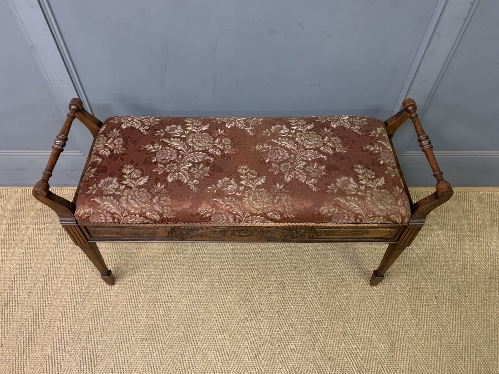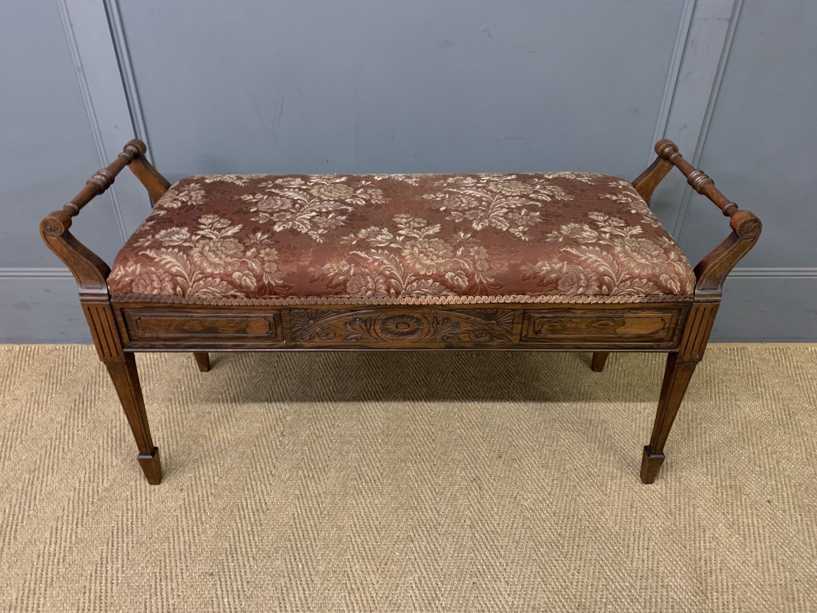 A lovely late Victorian period rosewood piano duet stool. Well constructed in solid rosewood and rosewood veneers with carved detailings in the Adams style. With carrying handles and lift up box seat. All standing on square tapering legs which terminate in spade feet. Upholstered in floral silk fabric. Offered for sale in very good original condition.