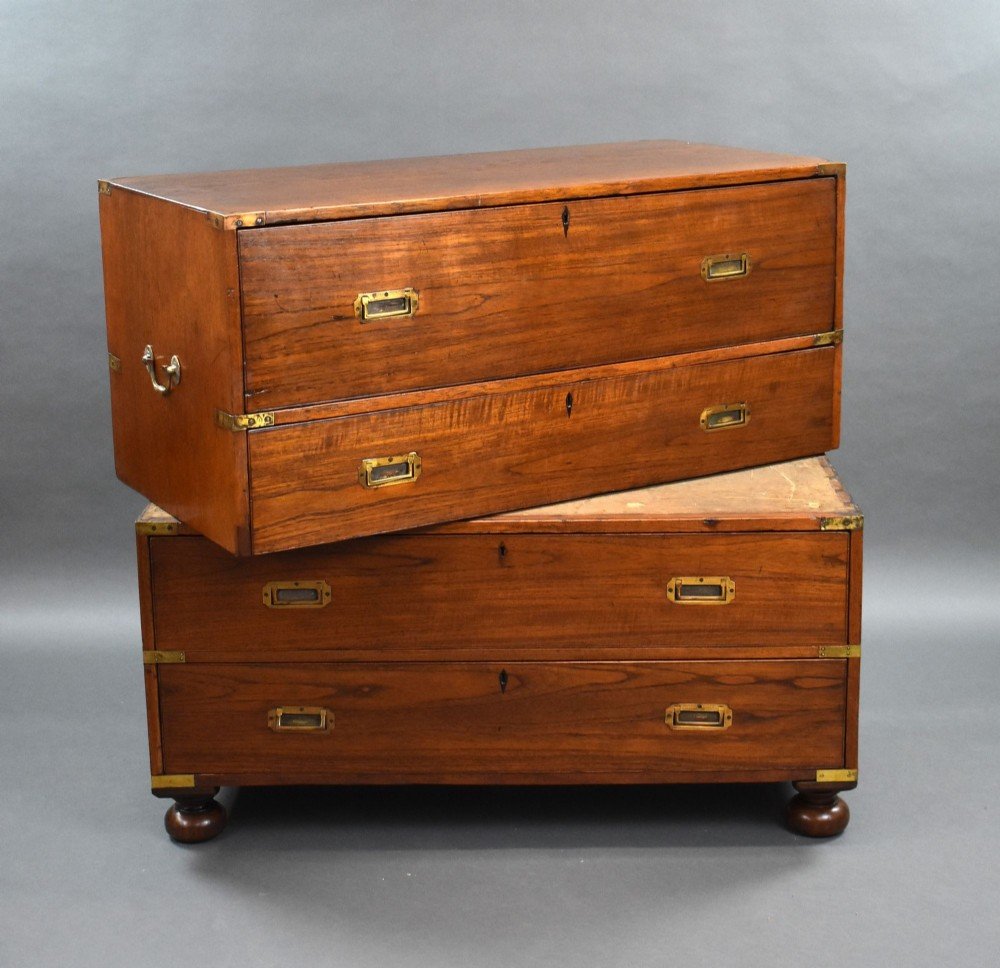 For sale is a good quality Victorian teak campaign secretaire chest, the top drawer with a fall front opening to a fitted interior, above three further drawers below, each with inset brass handles. The chest splits in to two halves, is raised on bun feet, remaining in excellent condition.