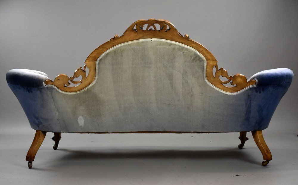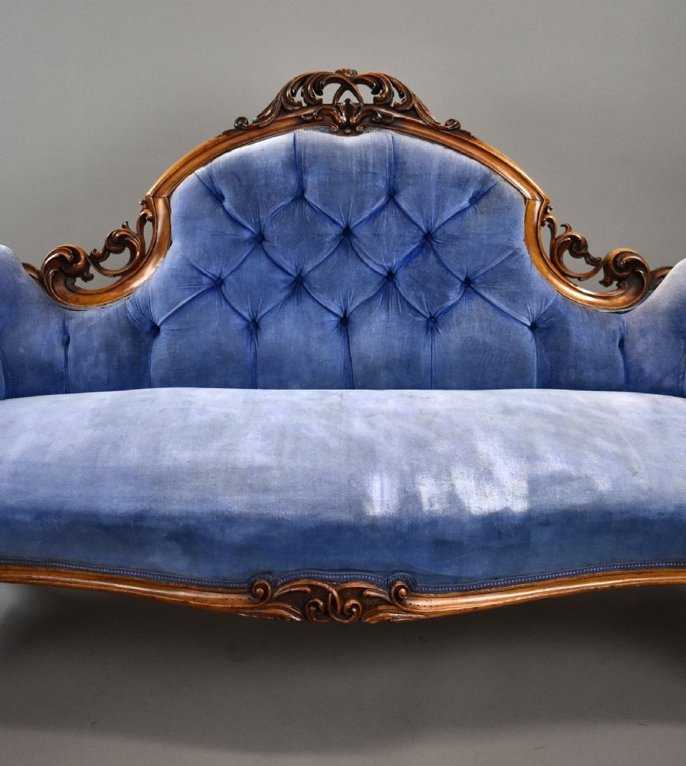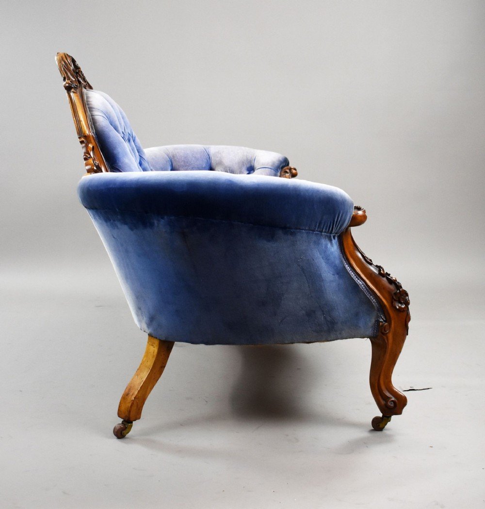 The graceful silhouette includes a serpentine backrest, sweeping arms, and cabriole legs on original brass castors. The current deep blue velvet upholstery showcases classic button-tufting and complements the rich patina of the walnut frame.