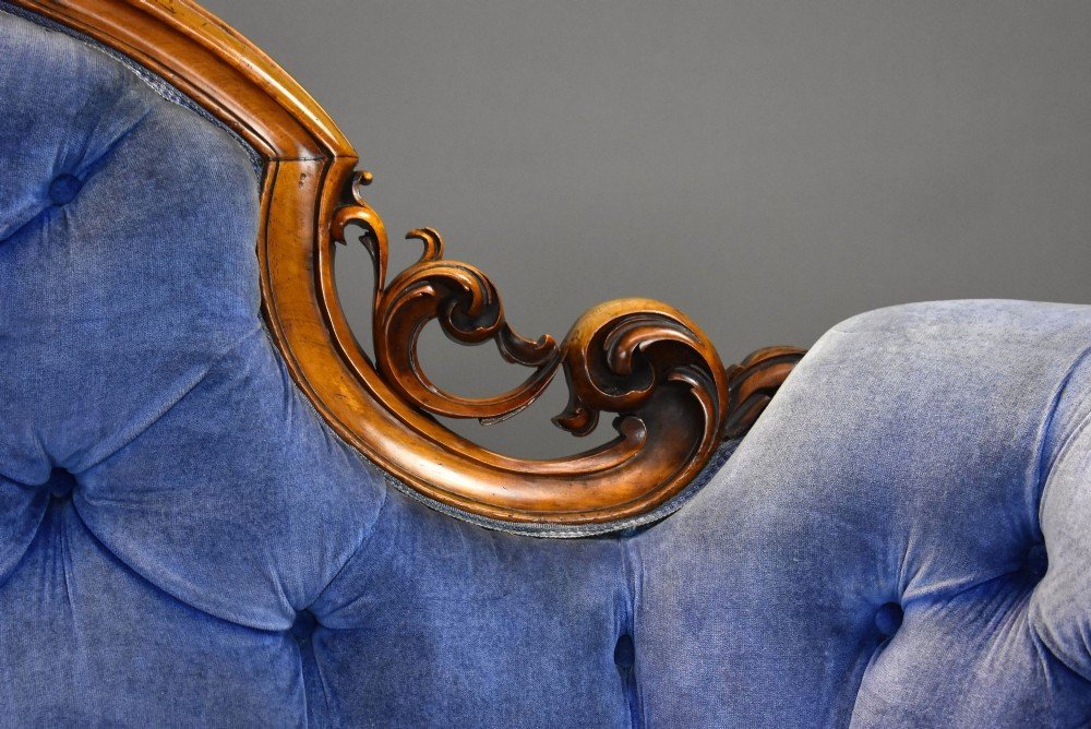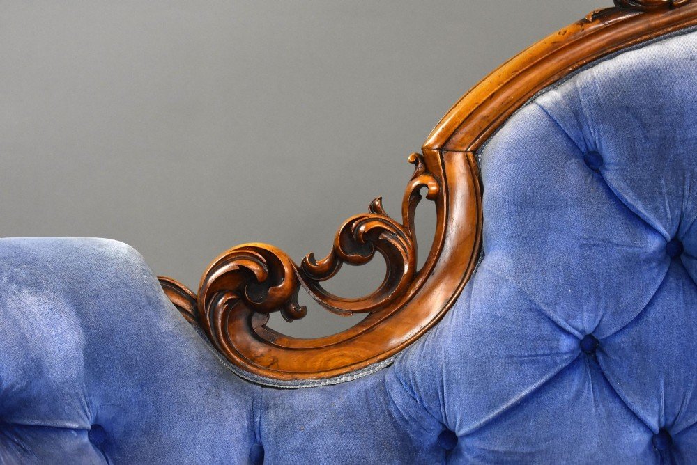 An elegant example of late Victorian craftsmanship, this double-ended sofa is beautifully framed in solid walnut, featuring intricate hand-carved floral and scroll motifs typical of the Rococo Revival style.