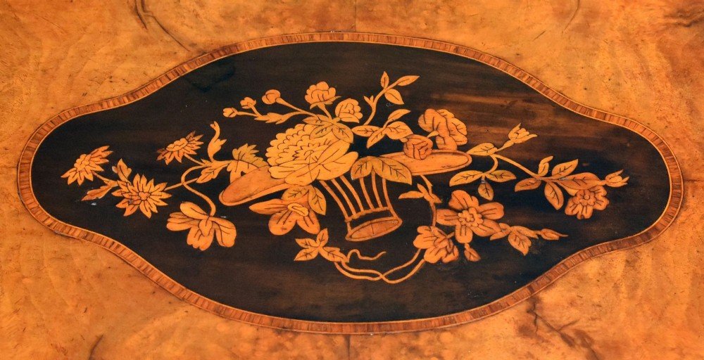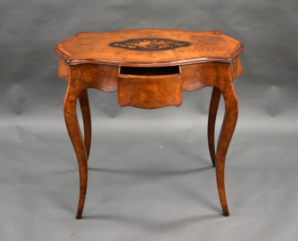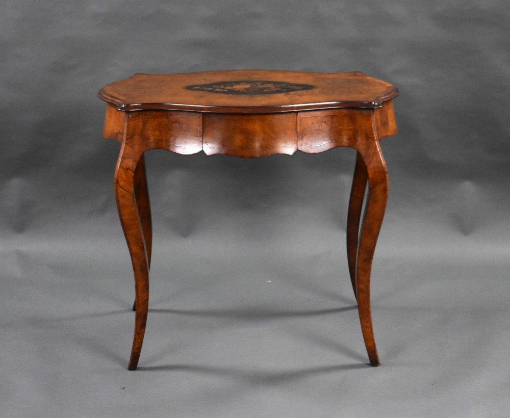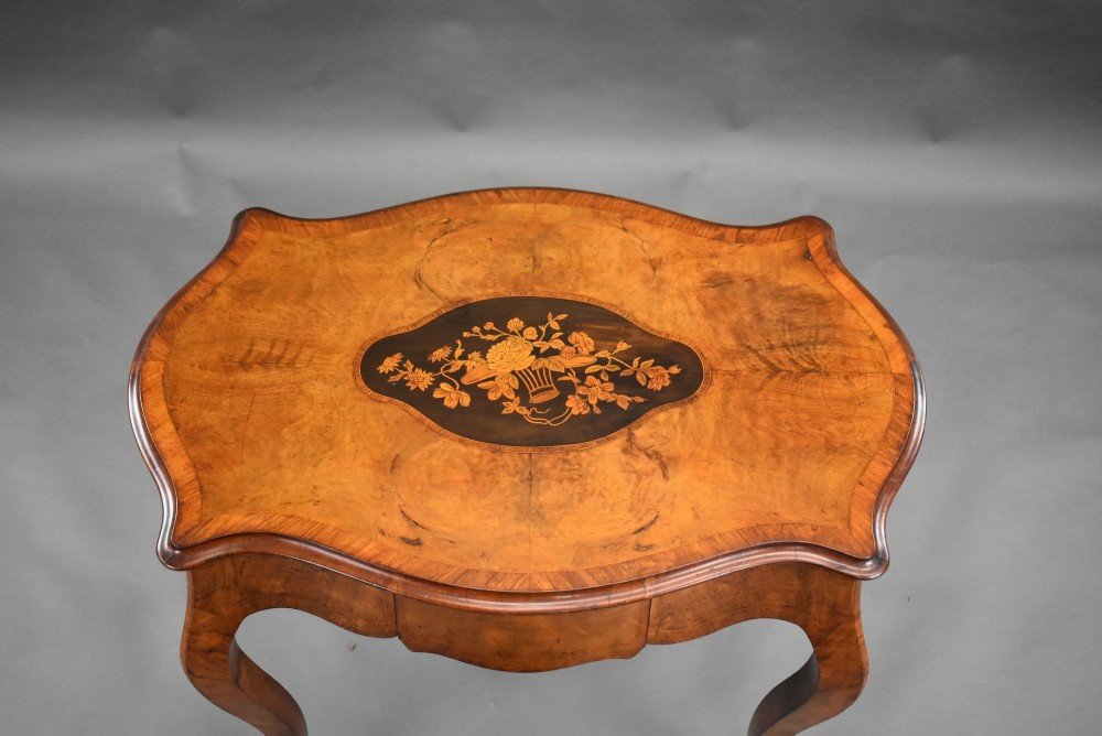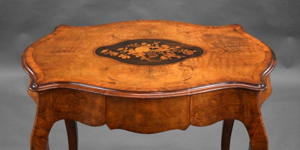 For sale is a good quality Victorian walnut marquetry centre table, serpentine in form, having an inlaid top above a central drawer, standing on elegant legs, this piece is in very good condition.