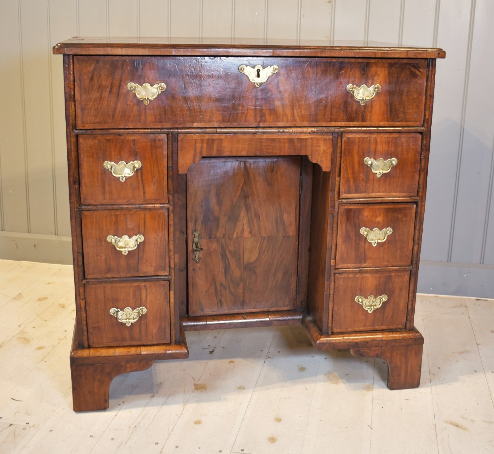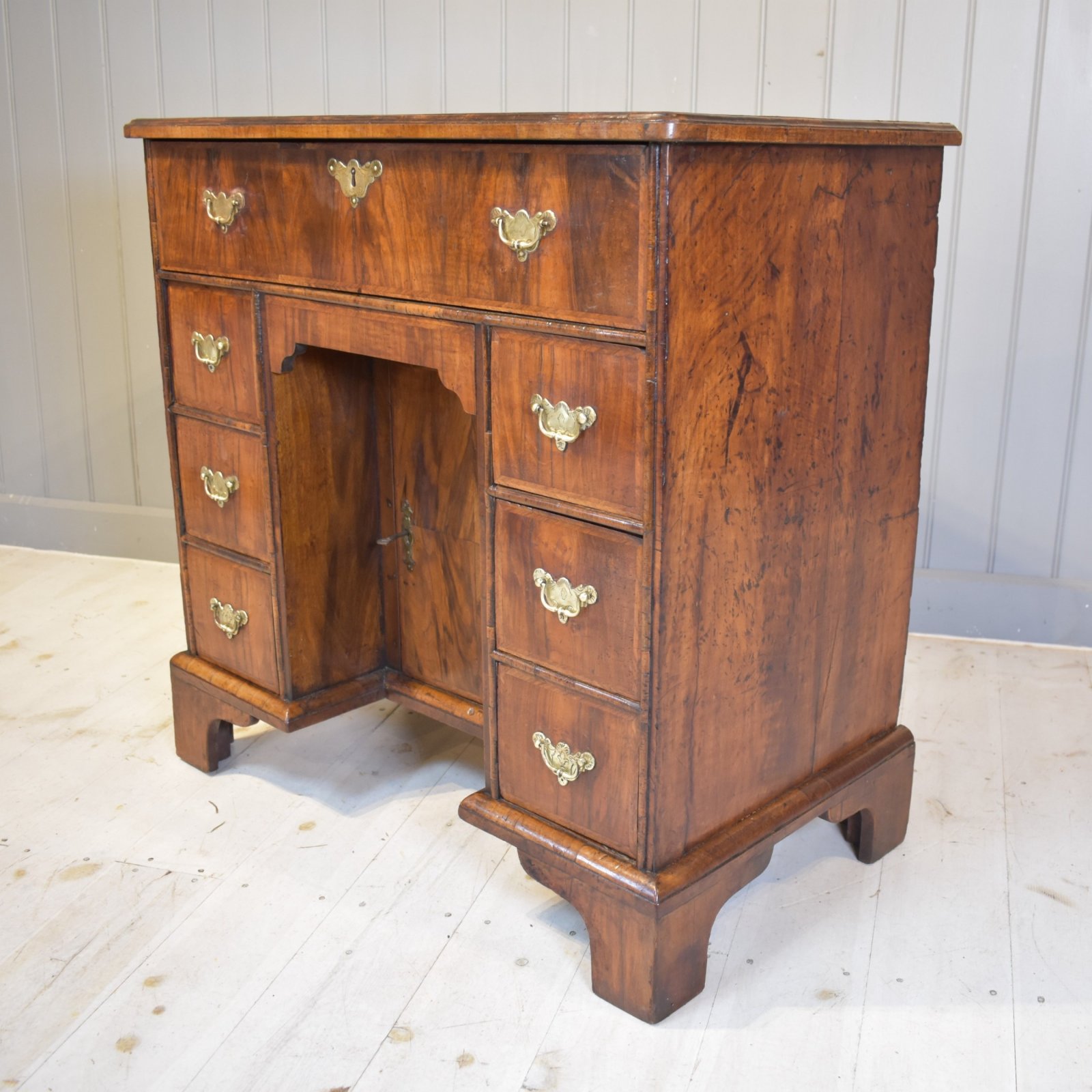 George I walnut kneehole desk circa 1720. This desk has a really lovely top with quarter cut veneer, feather stringing and crossbanding. The veneer chosen has been oyster cut, and unusually, the middle door is also quarter cut veneer. Above the door is a small drawer. All the drawers are oak lined and most of the handles are original (2 old replacements). It has walnut veneered sides and is altogether a really smart desk.