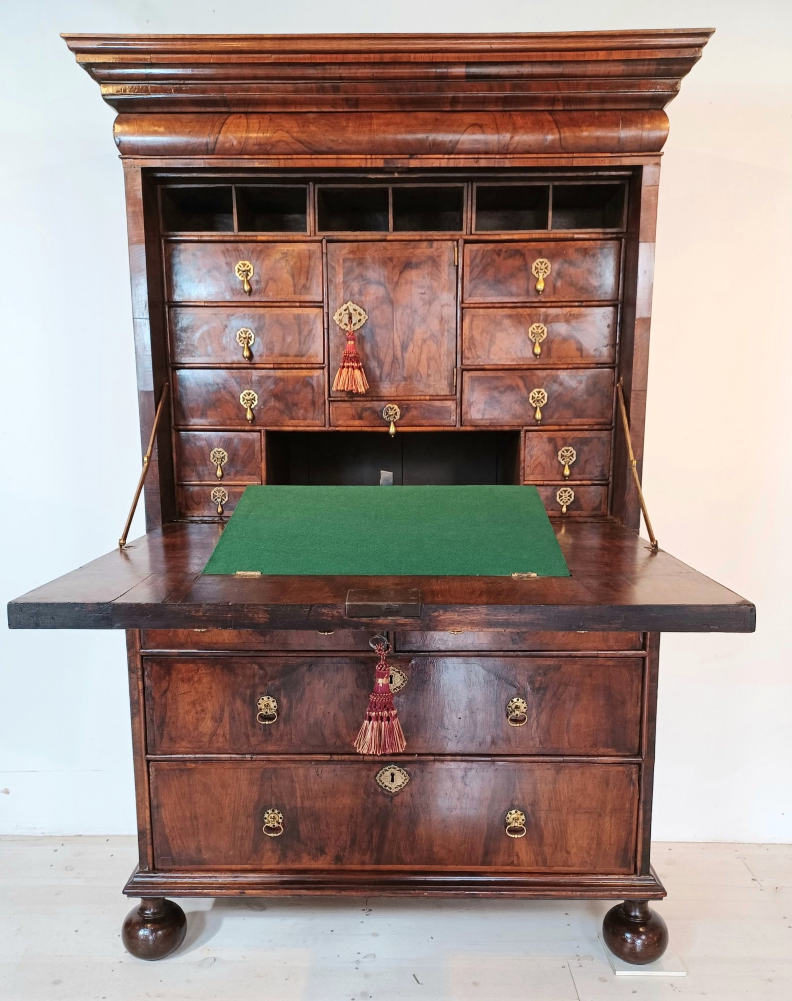 This piece consists of a top frieze drawer, and a fall with drawers below. Inside the fall are 10 drawers and 3 sliding compartments. There are another three drawers behind the inner door and it has an adjustable writing slope.