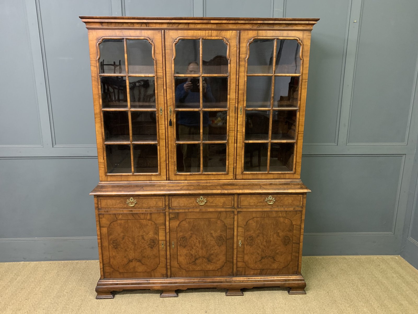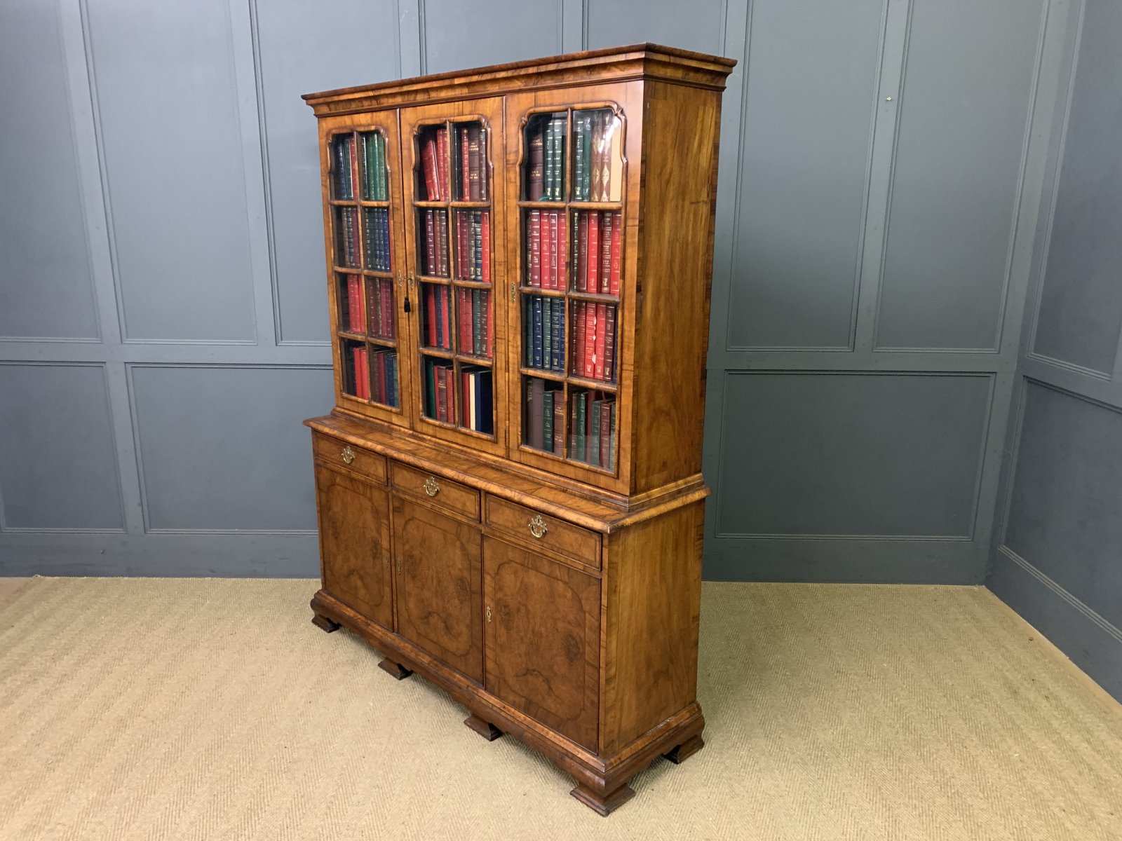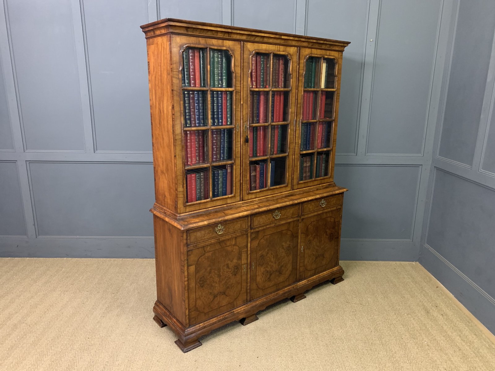 A lovely early 20th century bookcase by Waring & Gillow. In the queen Anne style and very well constructed in solid walnut with attractive burr walnut veneers onto a solid oak carcas. With an arrangement of 3 glazed doors over 3 drawers over 3 cupboard doors. All doors and drawers are lockable (key supplied). The glazed doors open to access display space with adjustable shelving. The cupboard doors open to reveal shelved interiors. All surmounted by an over-sailing cornice and standing on ogee bracket feet. With cross banding to the drawer and cupboard door fronts and with herringbone inlay to the top side of the base section. Sympathetically repolished in our workshops and now offered for sale in excellent condition with a warm colour and good patina.