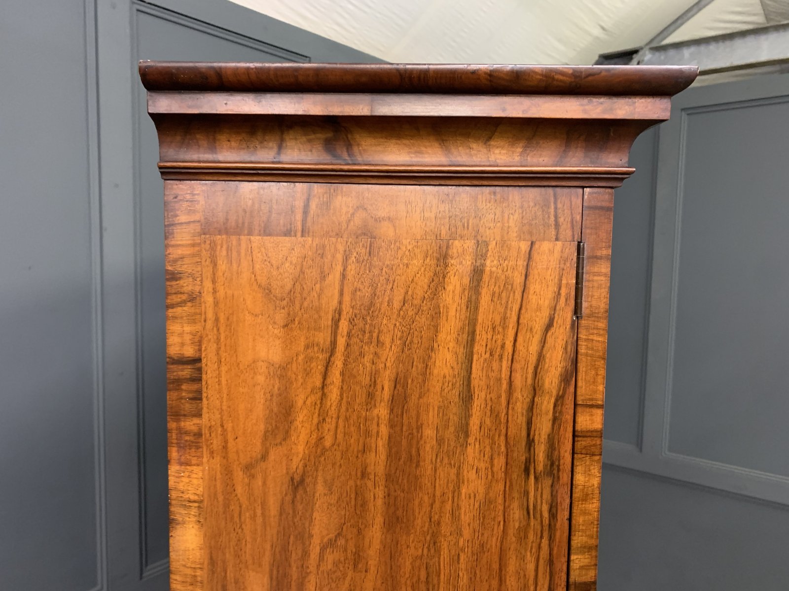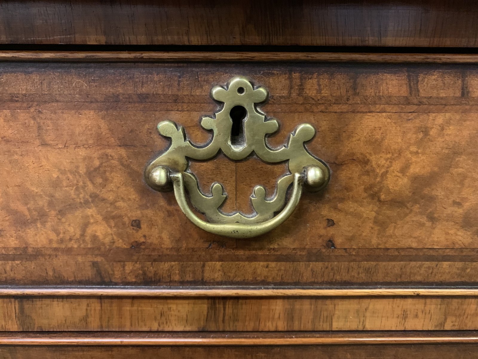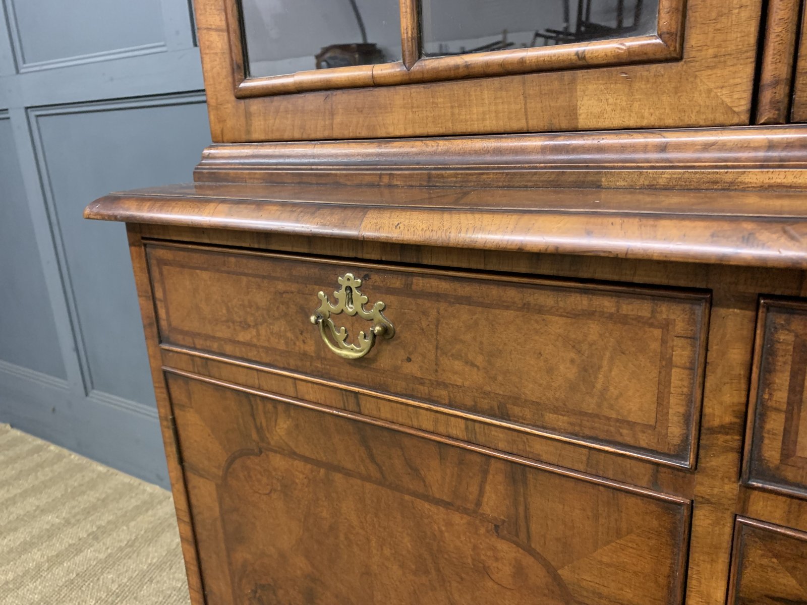 A lovely early 20th century bookcase by Waring & Gillow. In the queen Anne style and very well constructed in solid walnut with attractive burr walnut veneers onto a solid oak carcas. With an arrangement of 3 glazed doors over 3 drawers over 3 cupboard doors. All doors and drawers are lockable (key supplied). The glazed doors open to access display space with adjustable shelving. The cupboard doors open to reveal shelved interiors. All surmounted by an over-sailing cornice and standing on ogee bracket feet. With cross banding to the drawer and cupboard door fronts and with herringbone inlay to the top side of the base section. Sympathetically repolished in our workshops and now offered for sale in excellent condition with a warm colour and good patina.