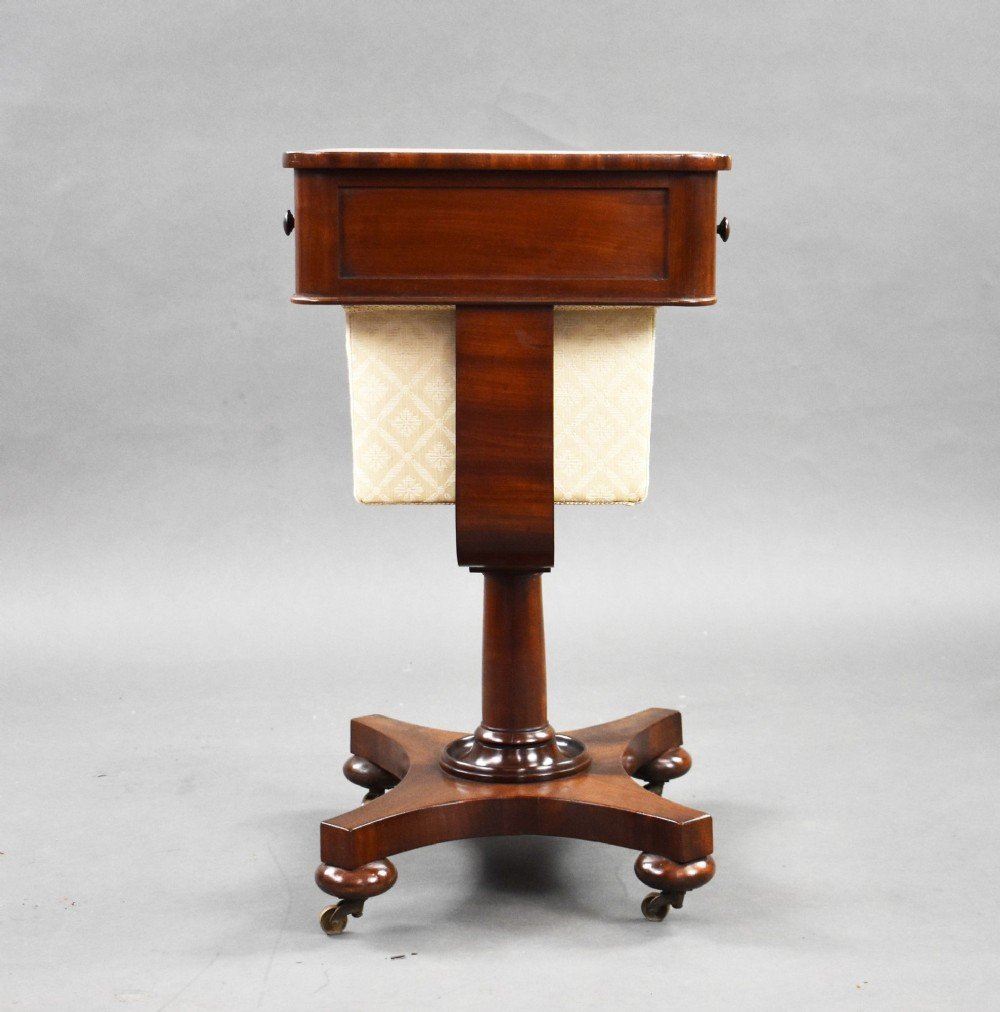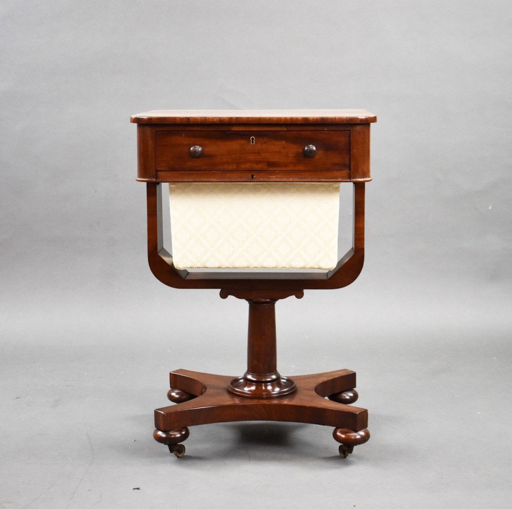 For sale is a good quality William IV mahogany work table, having a single drawer over a basket, above the stem terminating on a platform base on bun feet, raised on castors. This piece is in excellent condition for its age.
