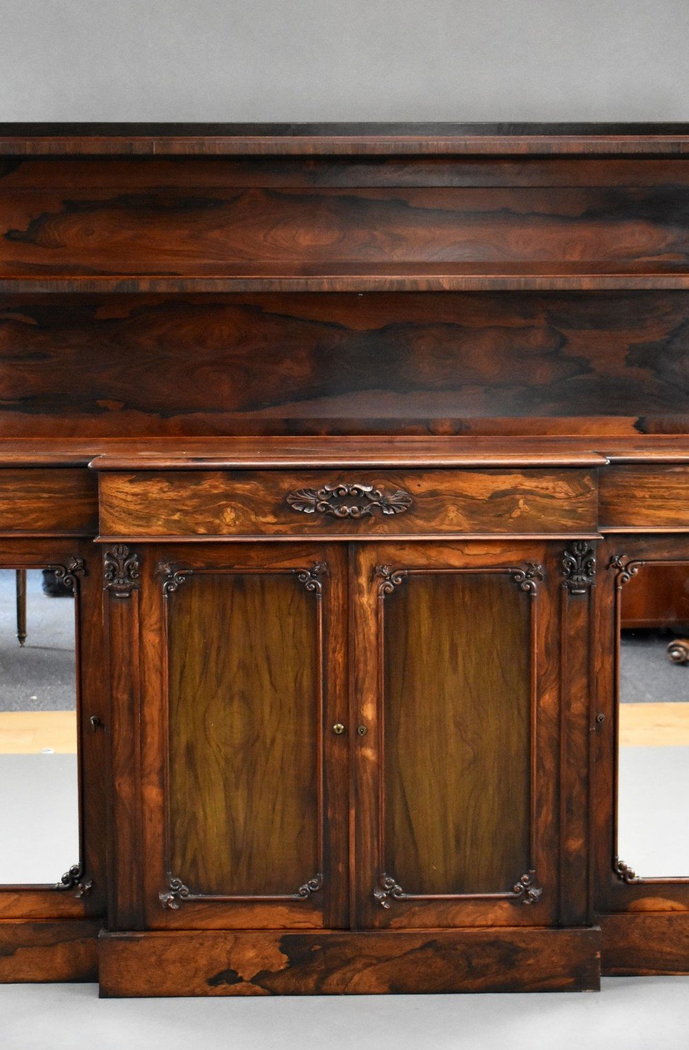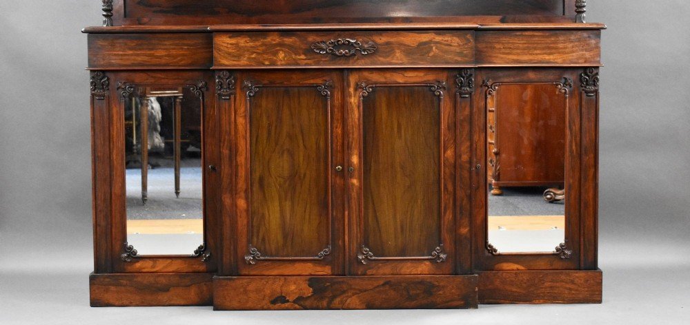 A fine quality William IV chiffonier, beautifully constructed in richly grained rosewood. The piece features a raised back with two fixed display shelves supported by turned uprights, all framed by a shaped gallery. The lower section offers a central cupboard flanked by mirrored panels, with carved foliate decoration to the stiles and door fronts. A shaped frieze drawer sits above the cupboard, adding both elegance and practical storage. The piece presents very well, with minor signs of wear commensurate with age and use. A refined and decorative piece ideal for dining or drawing room settings.