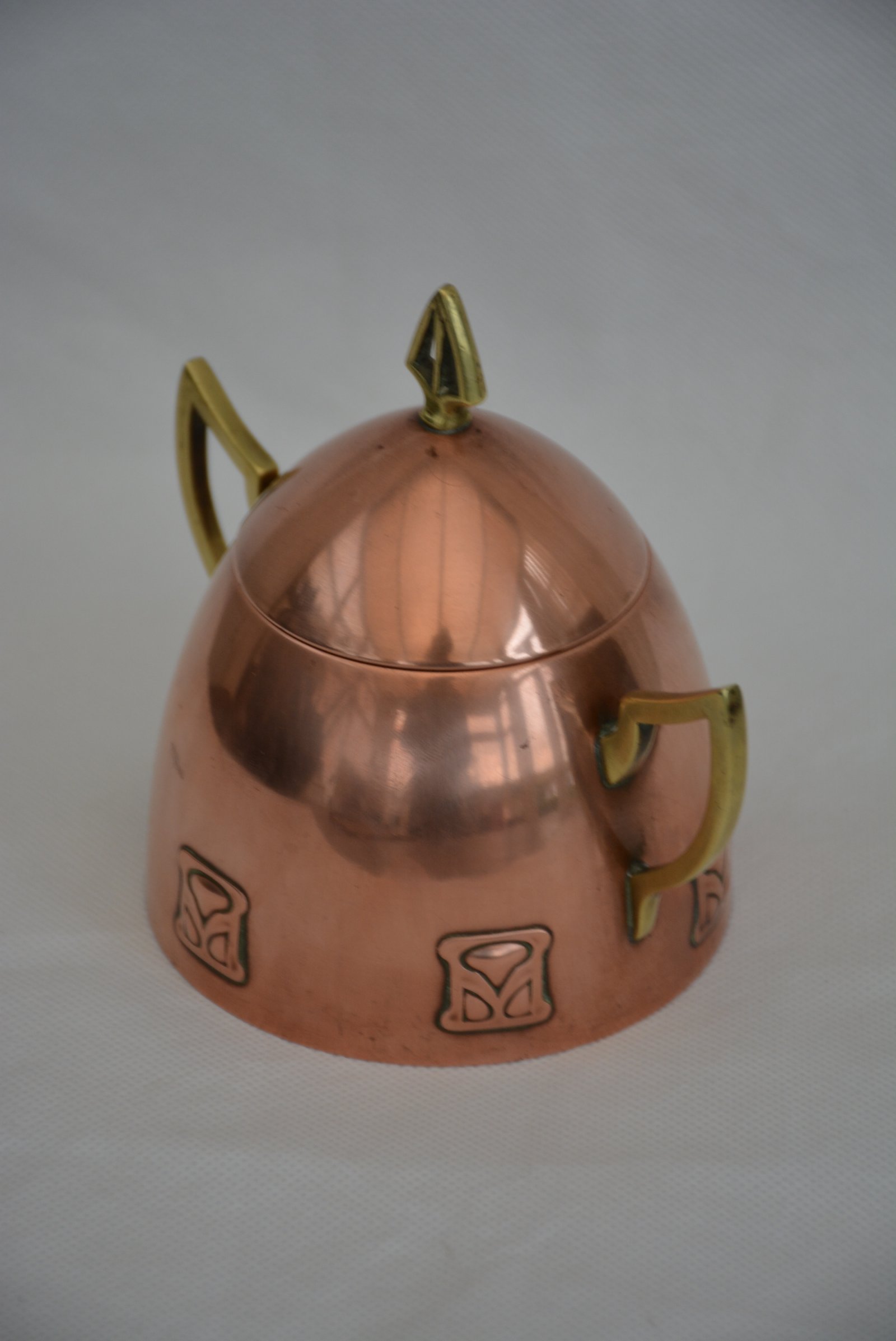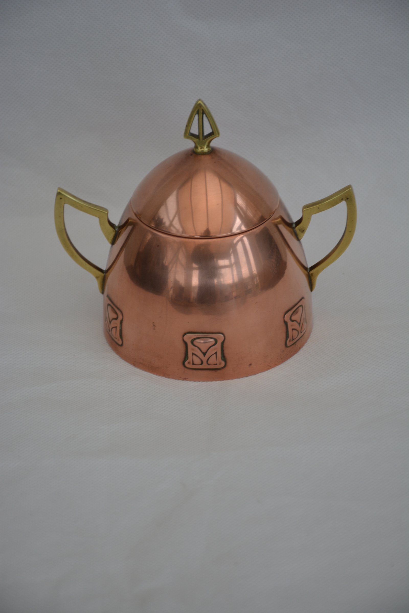 P0317 Very stylish WMF Art Nouveau Secession copper plated and brass sugar bowl with original lift up lid, two brass handles and embossed decoration throughout. This antique sugar bowl has been cleaned and polished, all in home ready condition. No repairs, original.