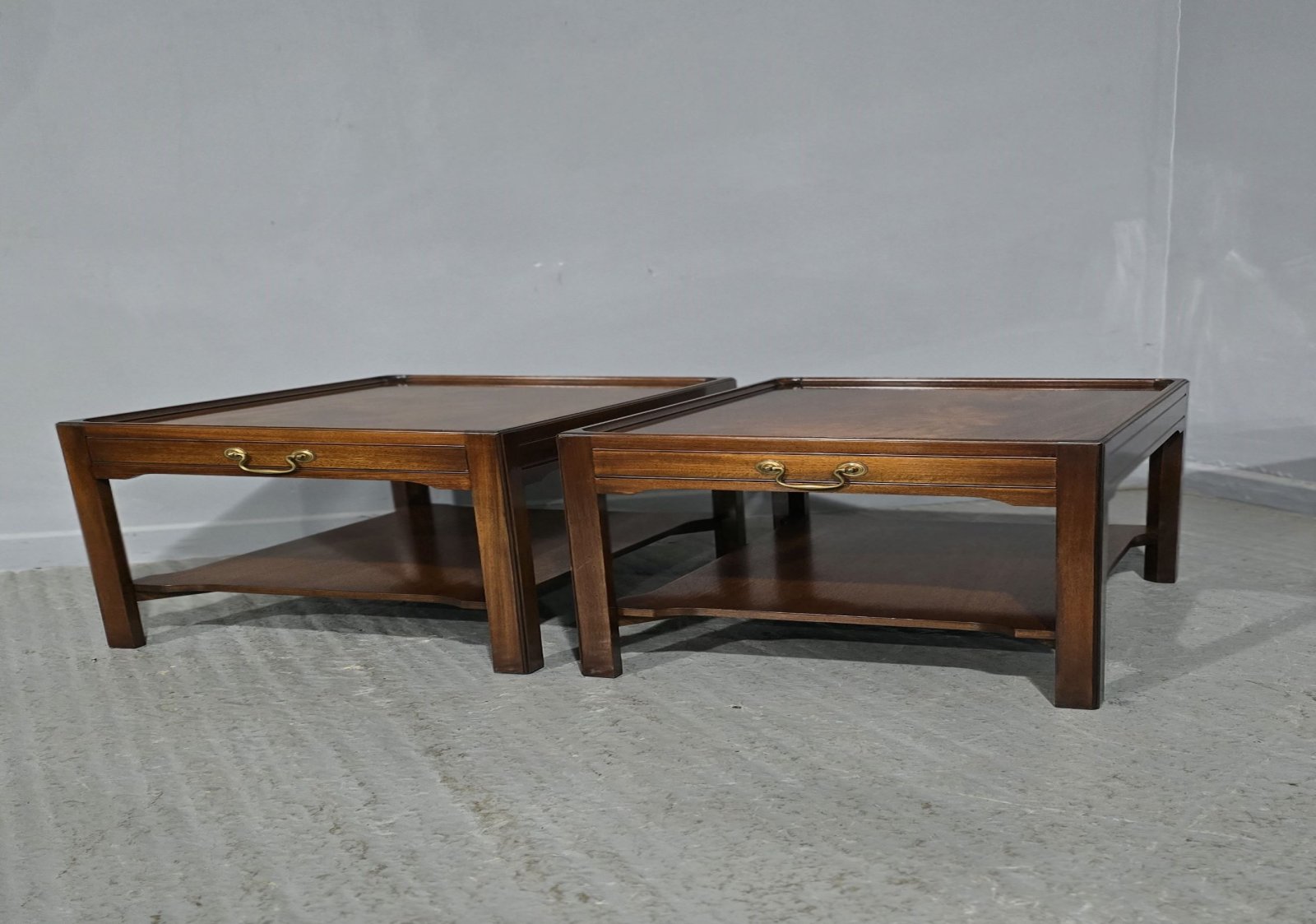 A very nice pair of solid flame mahogany end, lamp tables, tray topped each with a single drawer and undertier, in very nice condition having been waxed and cleaned in our own workshops.